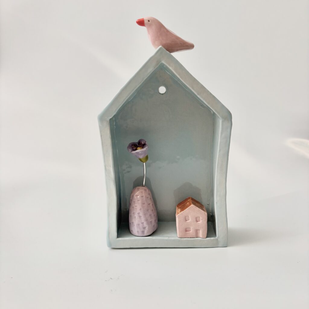 Huisje lichtblauw met roze vogel