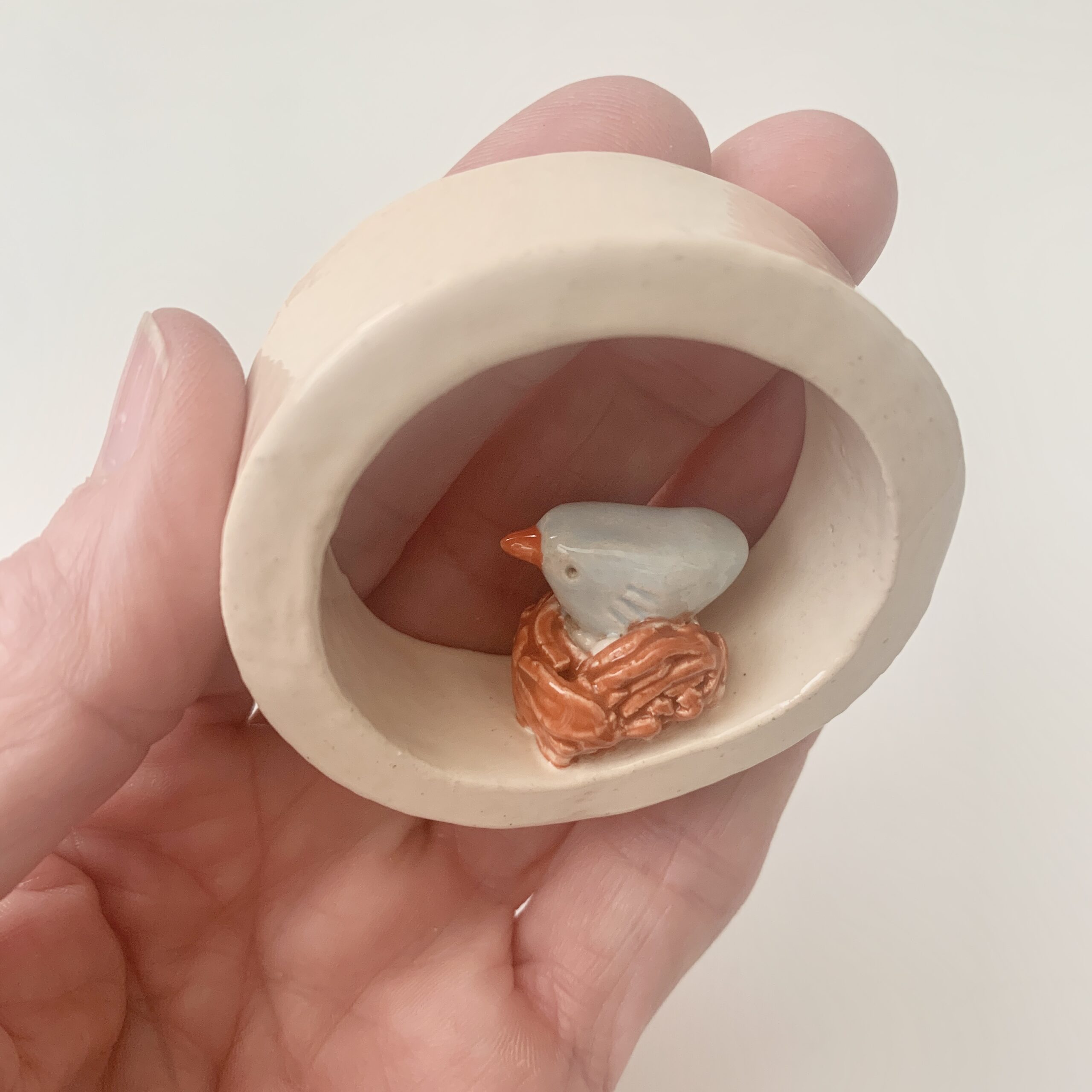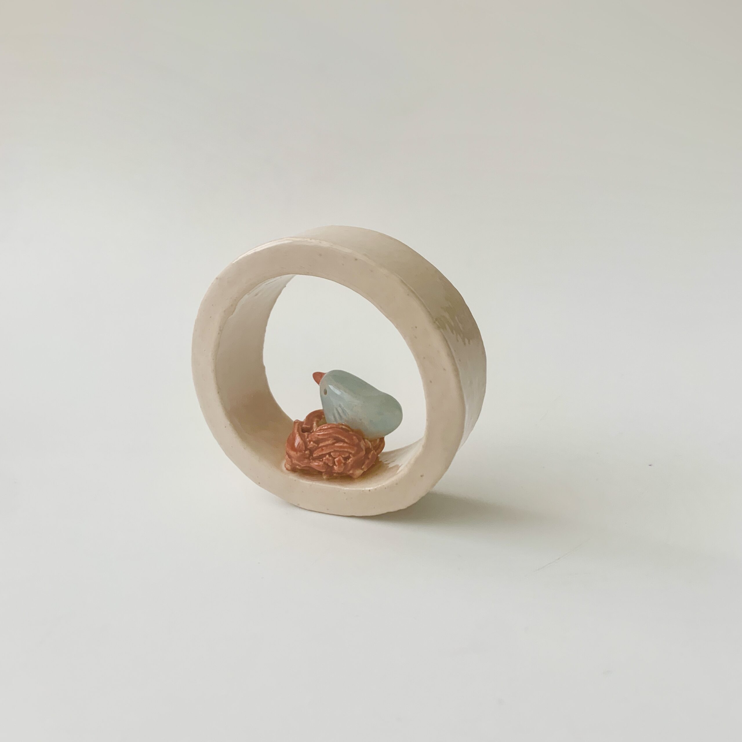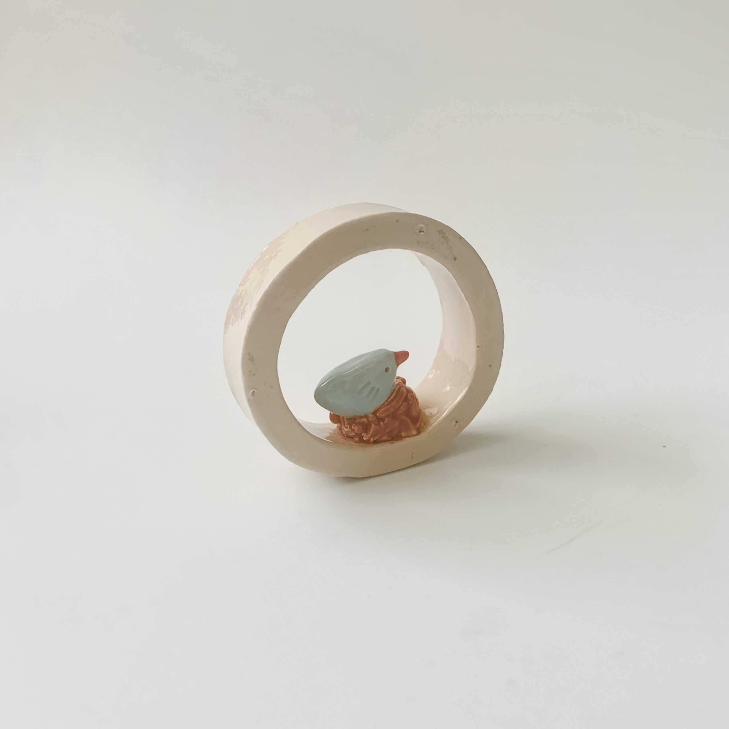 Blauwe vogel in een rondje van keramiek. Ik heb dit vogeltje op het nestje en het lijstje met de hand gevormd en daarna heb ik het geheel geglazuurd. Een uniek cadeau voor jezelf of iemand anders. Met een lintje eraan hang je het straks in de paasboom. Er is maar één uniek exemplaar.