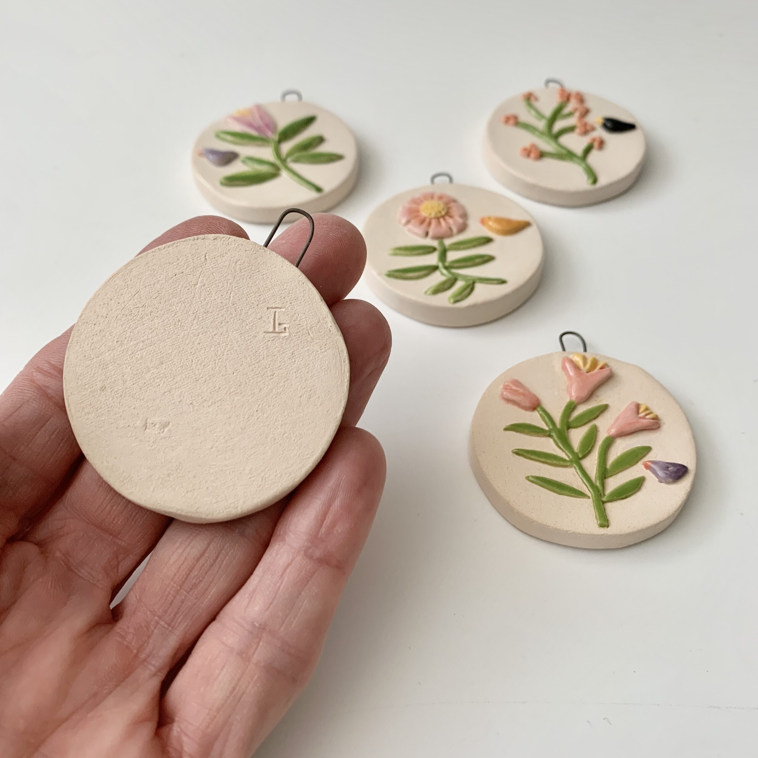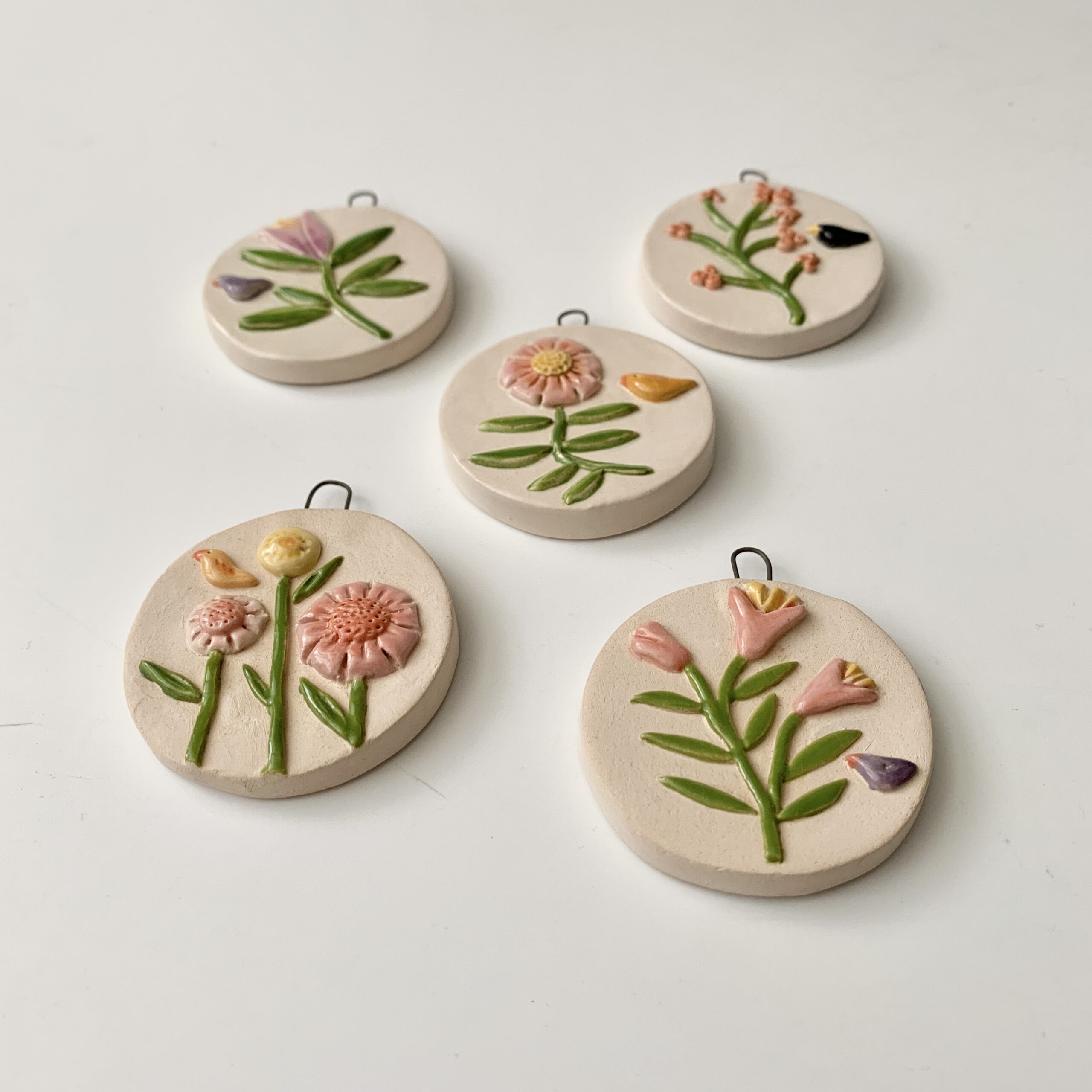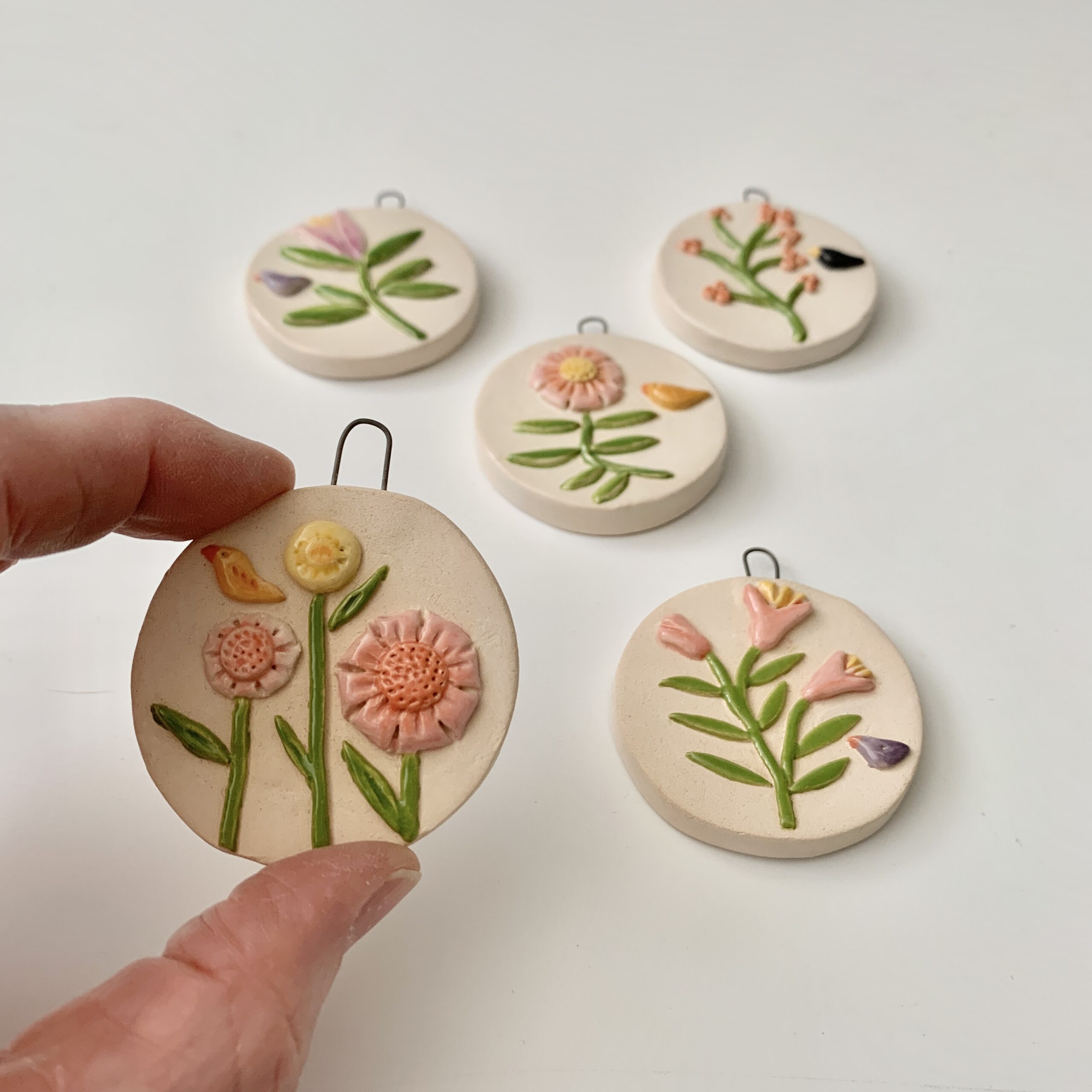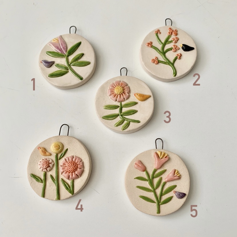 Bloemen hangers, een schilderijtje gemaakt van klei. Een blikvanger in de kerstboom of een mooi en uniek cadeau, want van elke hanger is er maar een uniek exemplaar.