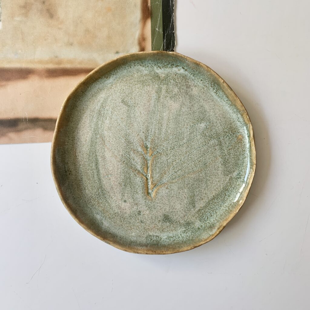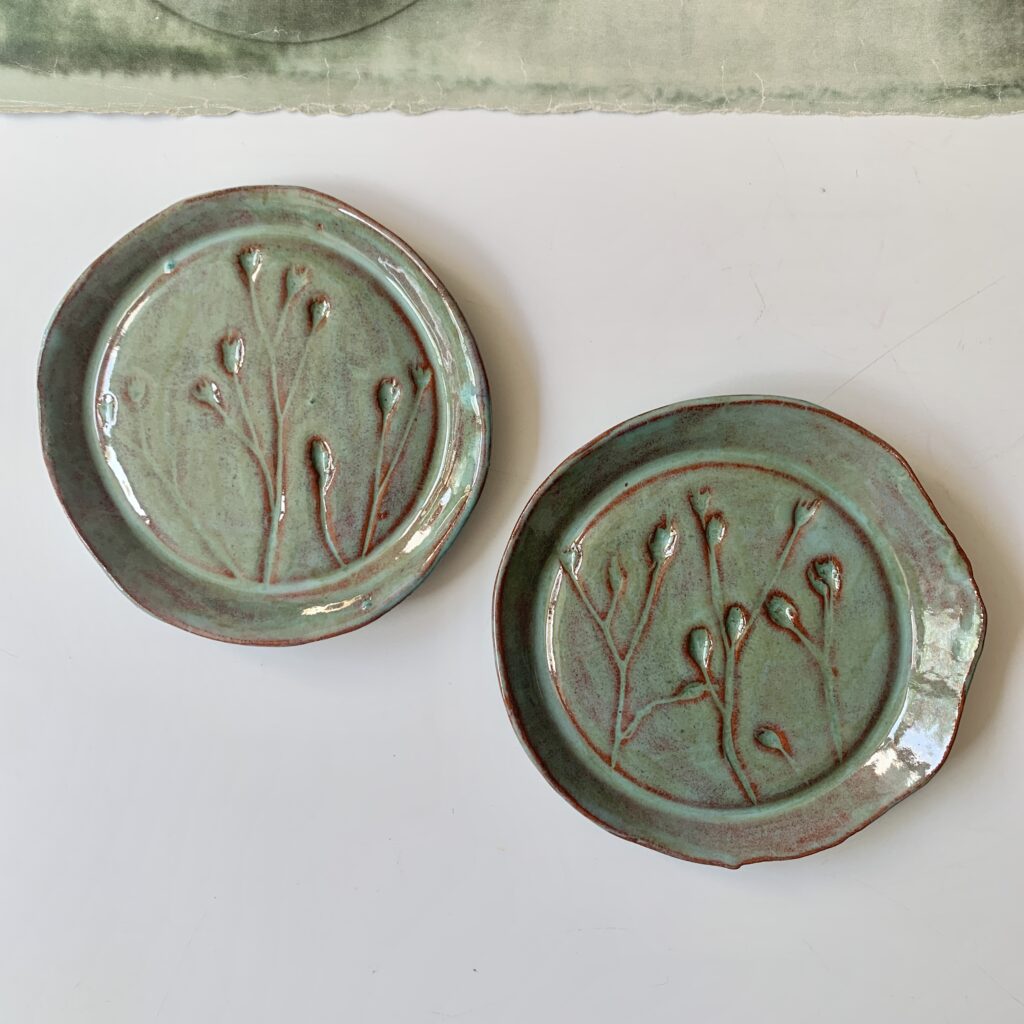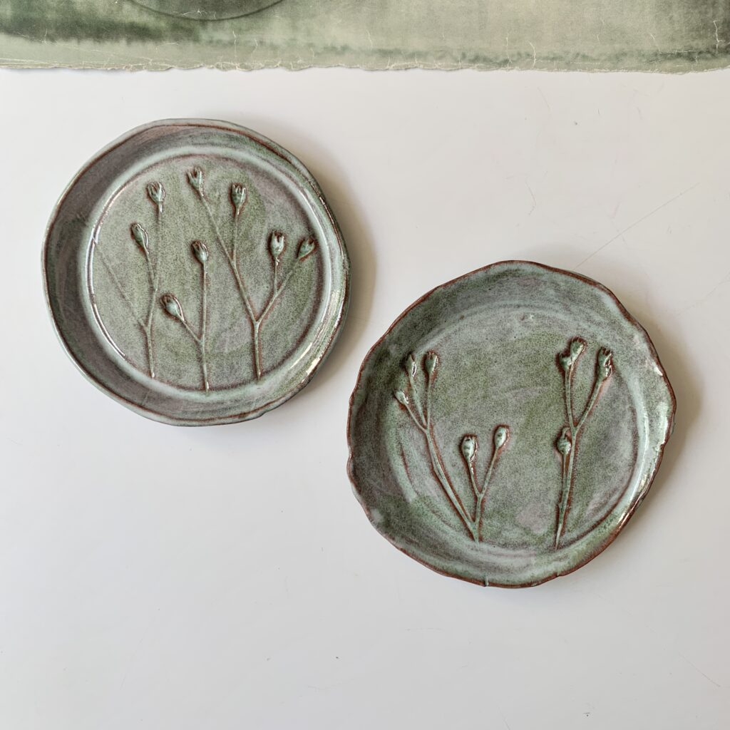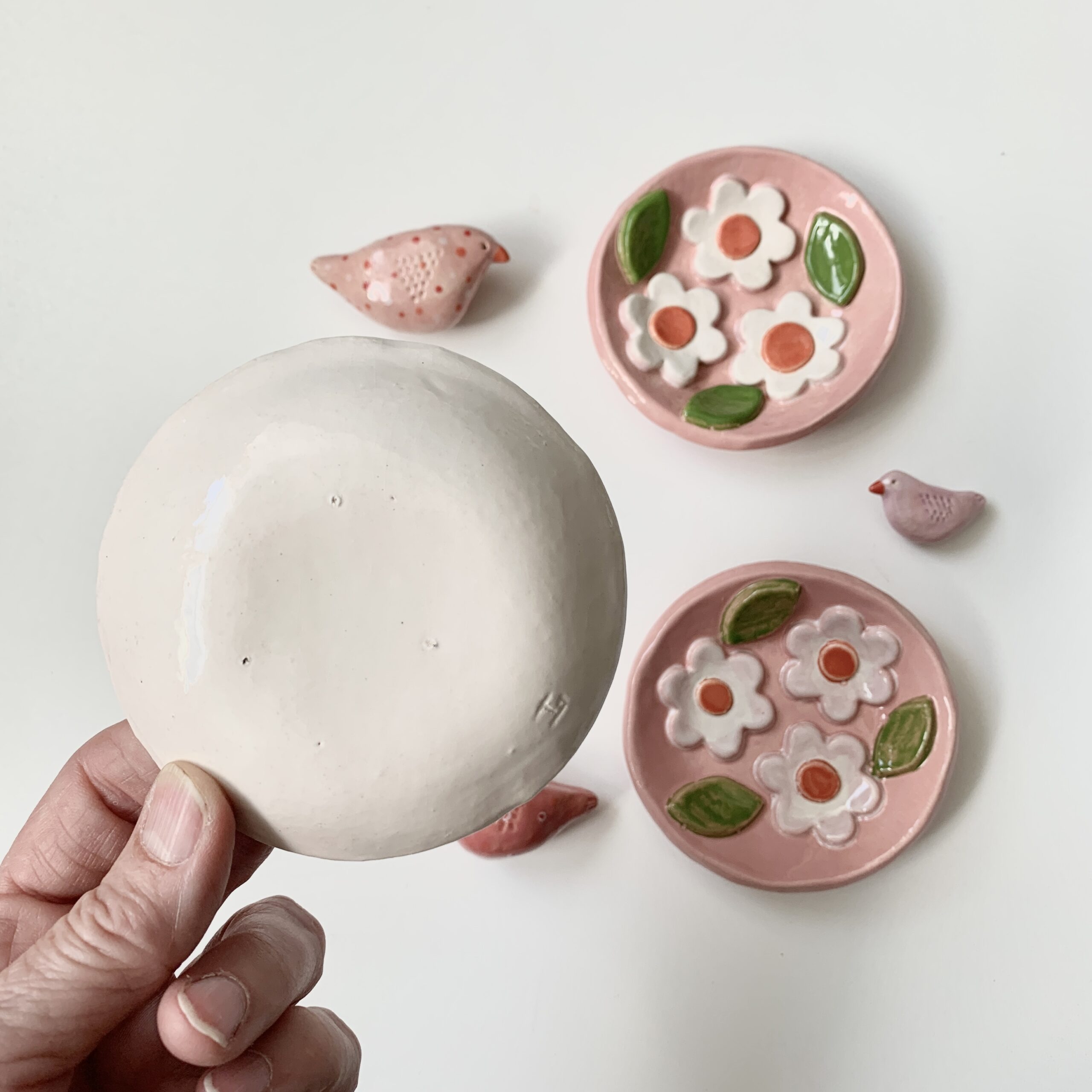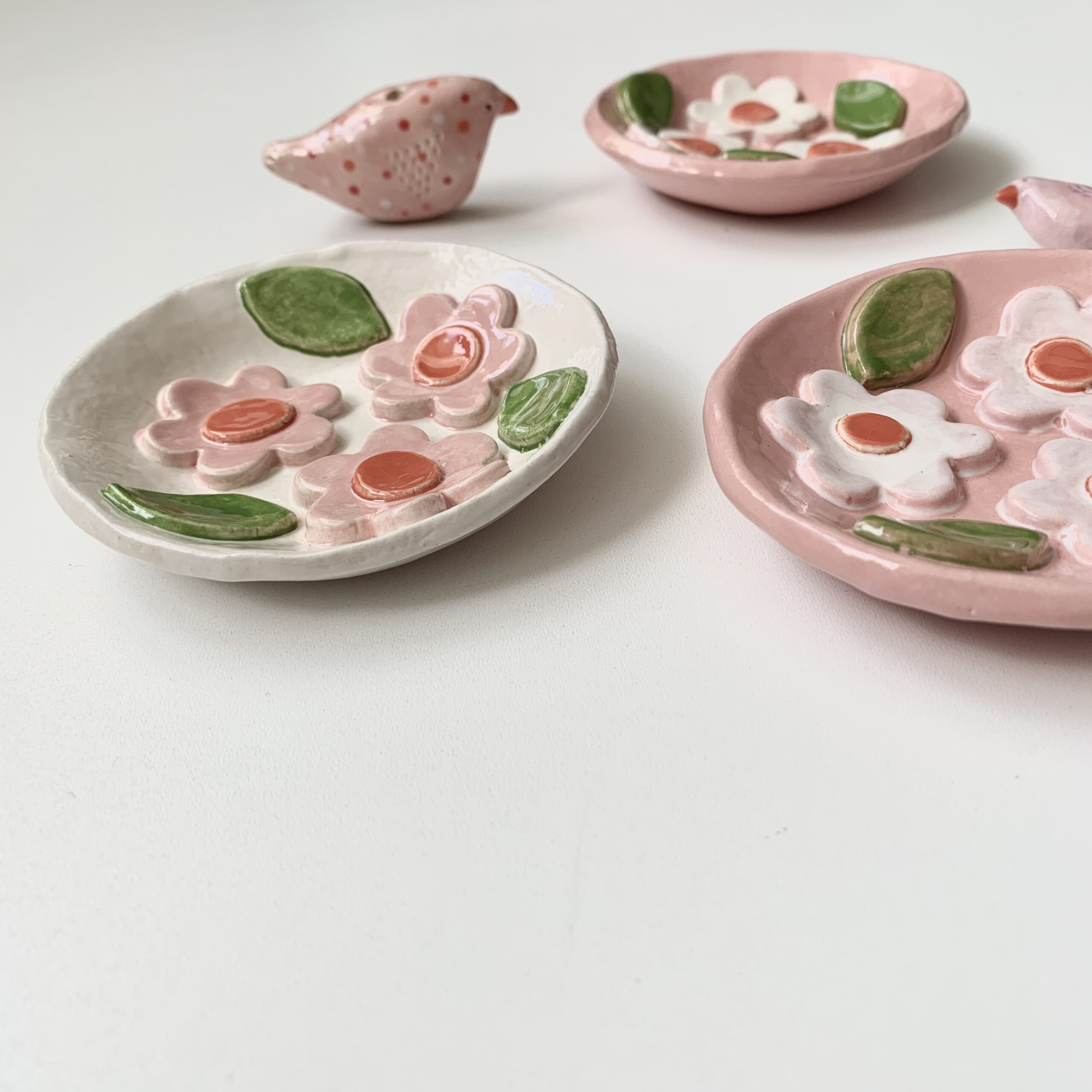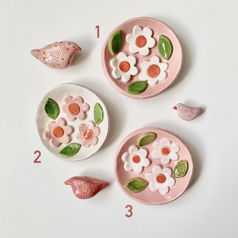 Deze bordjes bloem roze of wit van keramiek heb ik handgevormd. Daarna heb ik er verschillende blaadjes en bloemetjes van klei op ’geplakt’ en beschilderd met glazuur. Ze zijn helemaal handgevormd en uniek.