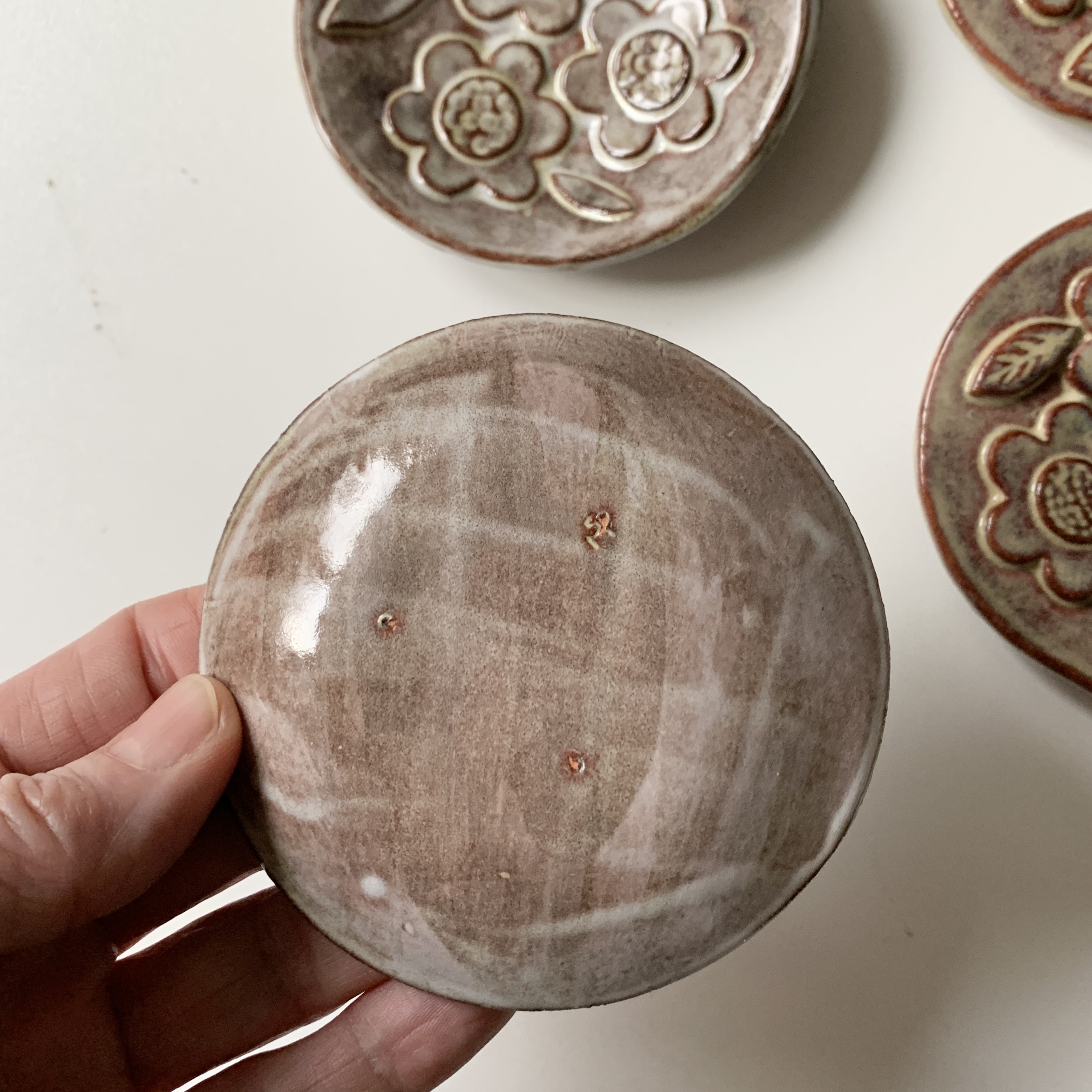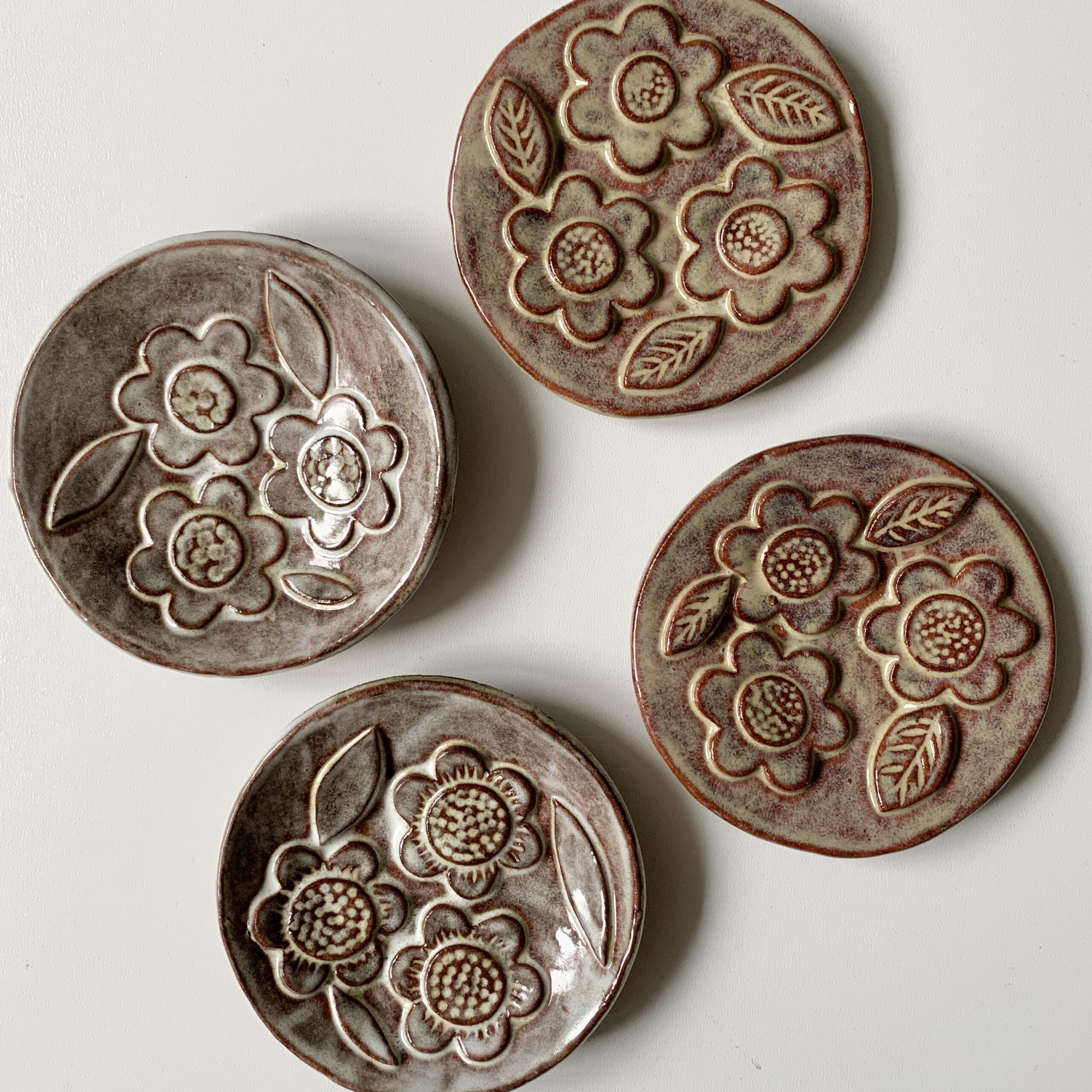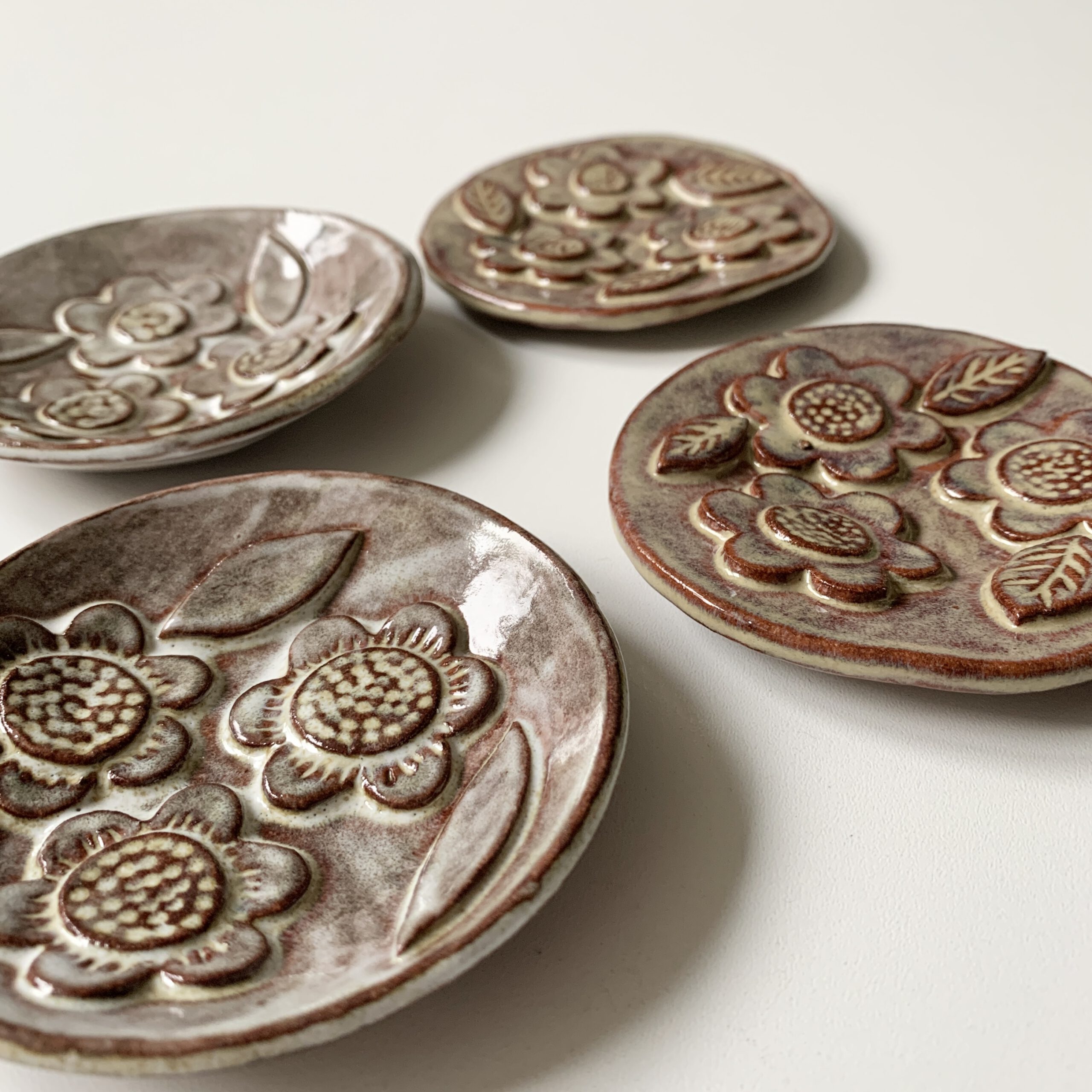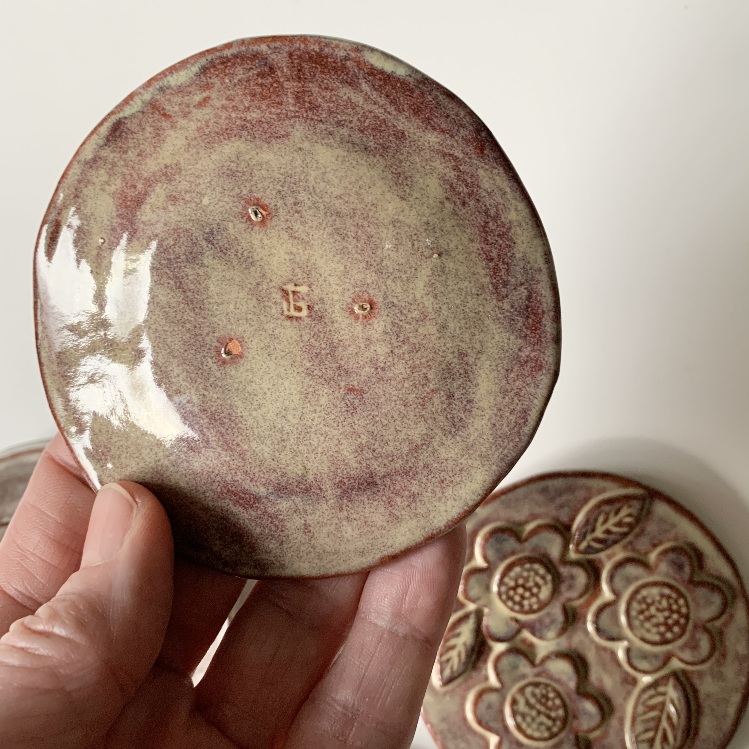 Van deze bordjes zijn er vier. Ik heb ze met zorg van klei gemaakt en geglazuurd.