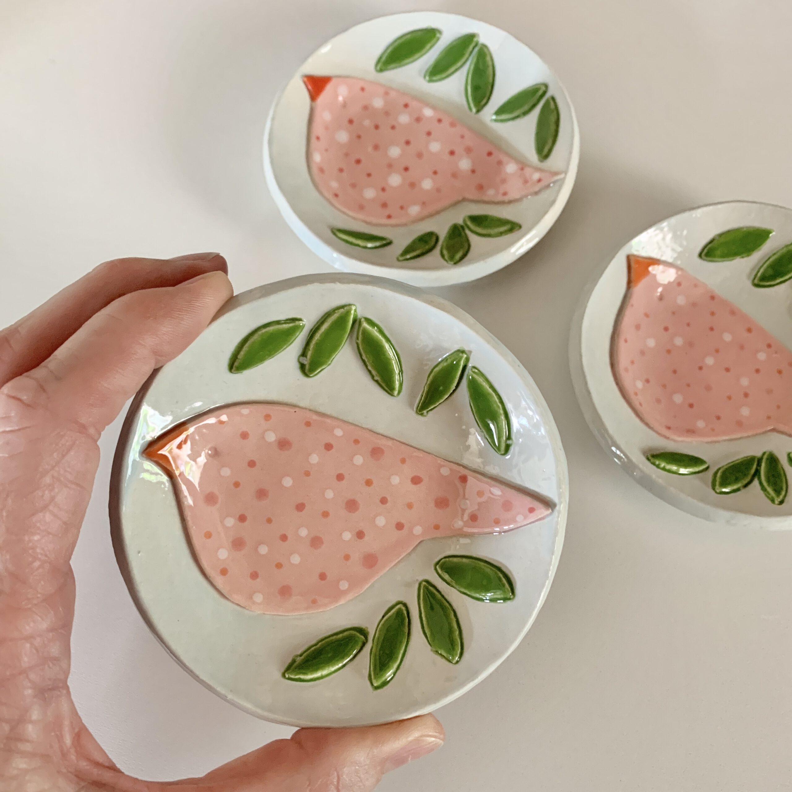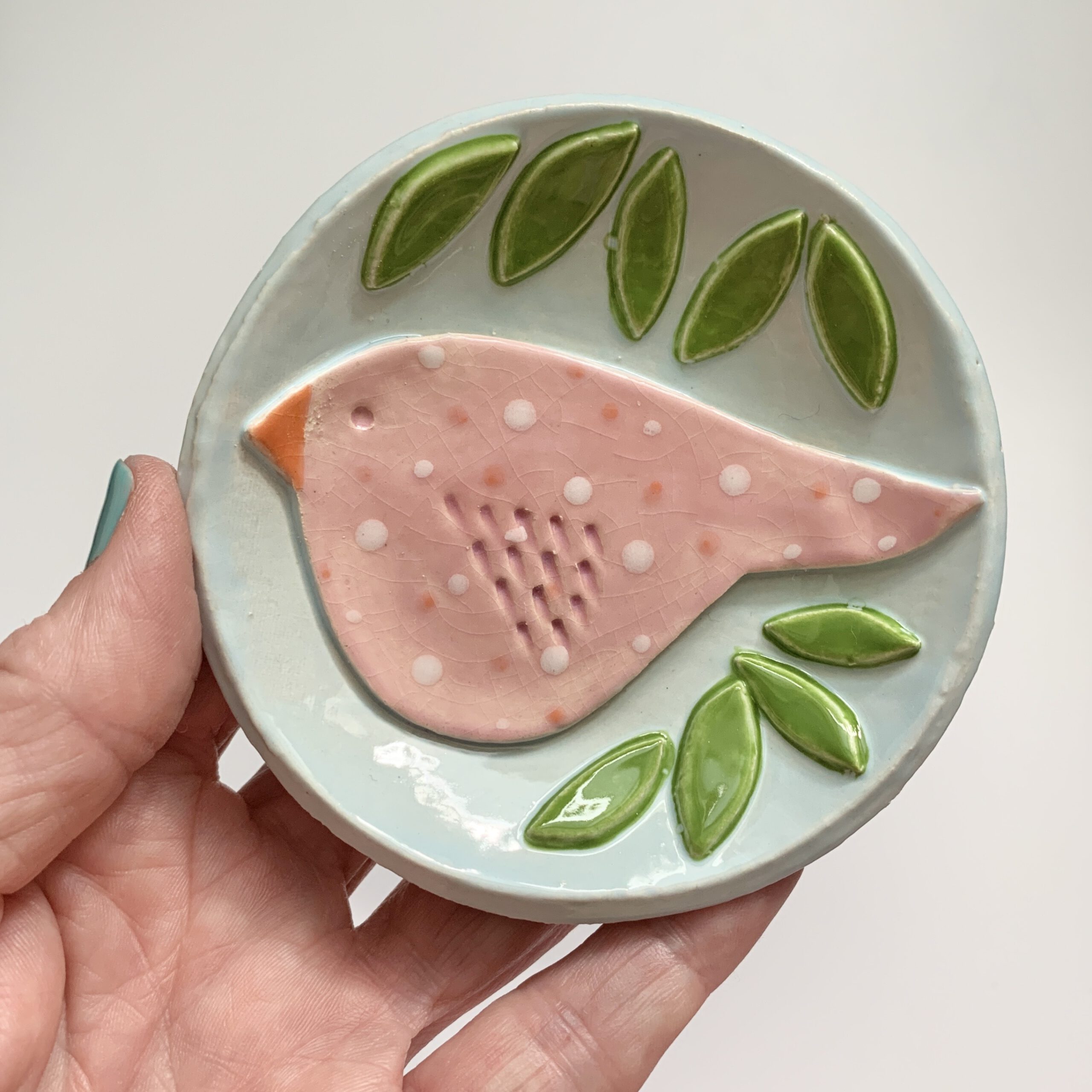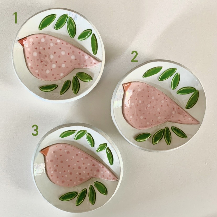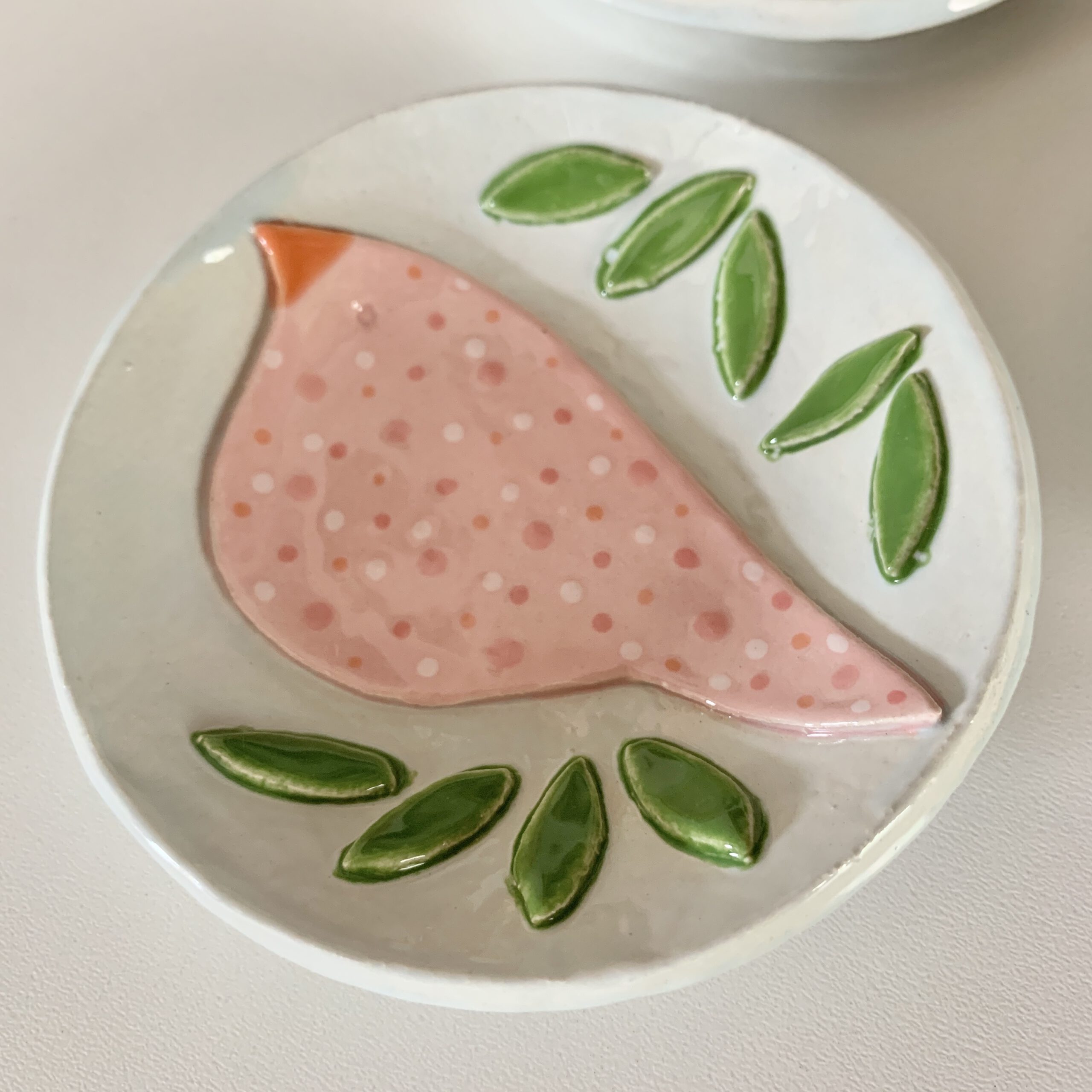 Dit bordje met vogeltje heb ik met zorg helemaal handgevormd en geglazuurd. Dit is dan ook een uniek exemplaar. Serveer er iets lekkers op, bewaar er je oorbellen op of geef het cadeau aan een vogelliefhebber.