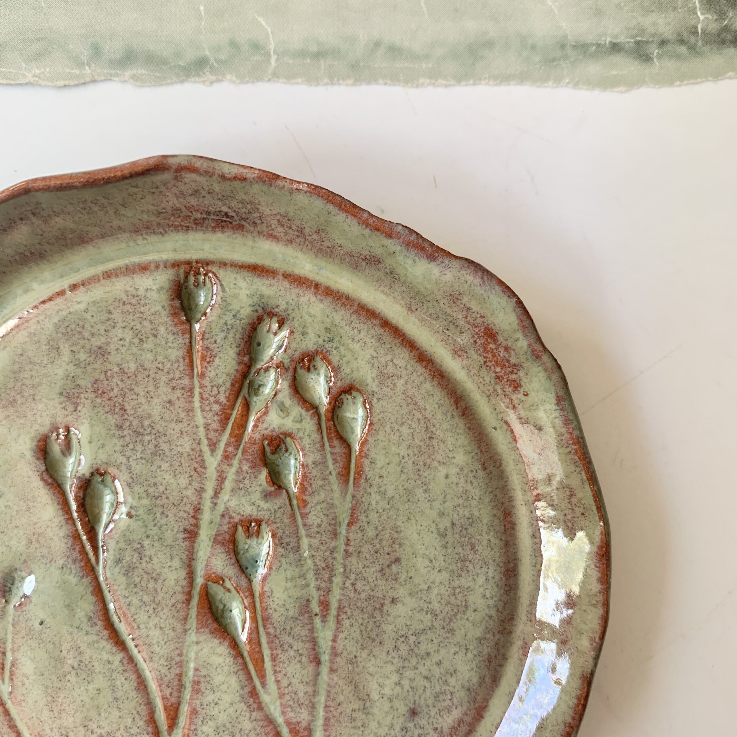 In het bordje natuur groen van keramiek heb ik een kleine plant afgedrukt, waardoor dit natuurlijke patroon ontstond. Het is handgevormd en uniek. Bewaar er je sieraden op , gebruik het voor theezakjes, als bordje voor iets lekkers of geef het aan een bijzonder iemand cadeau.