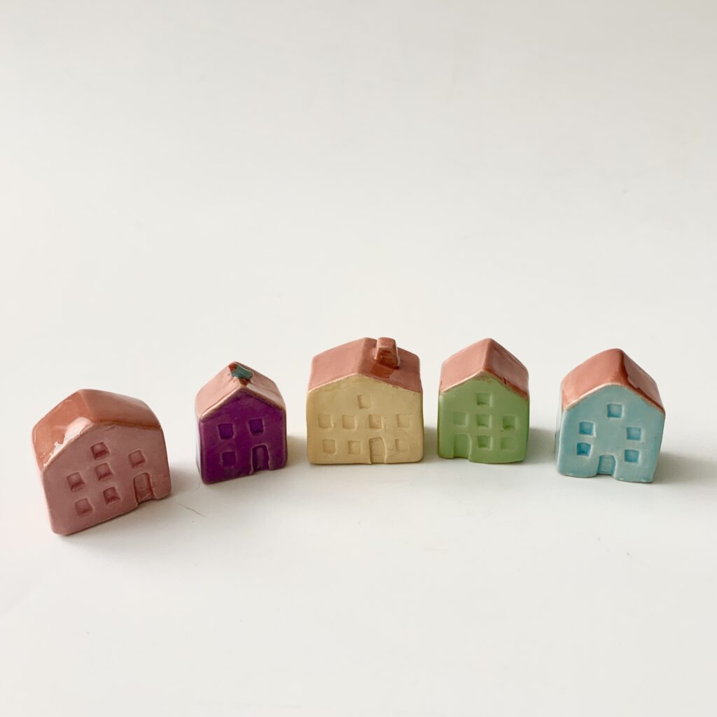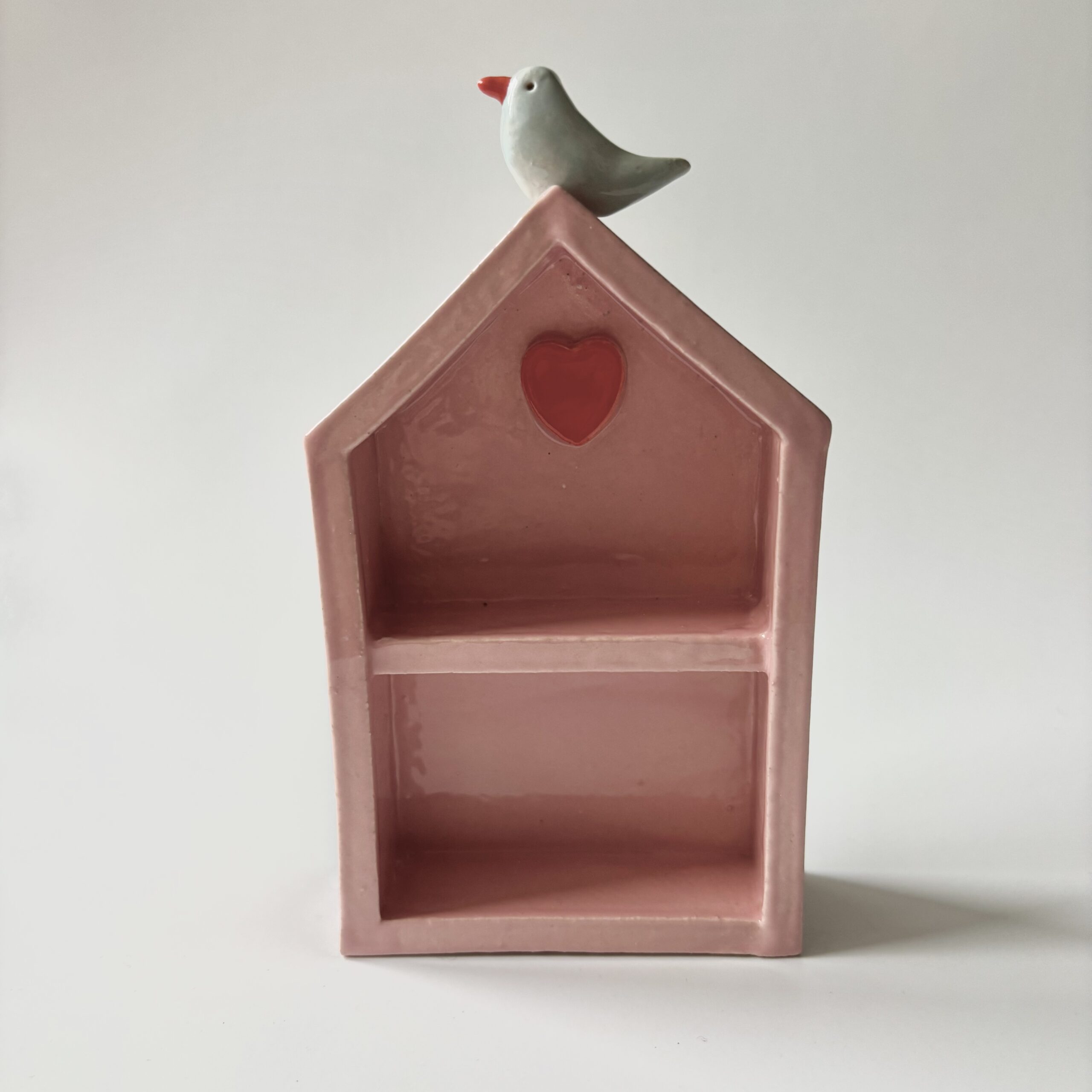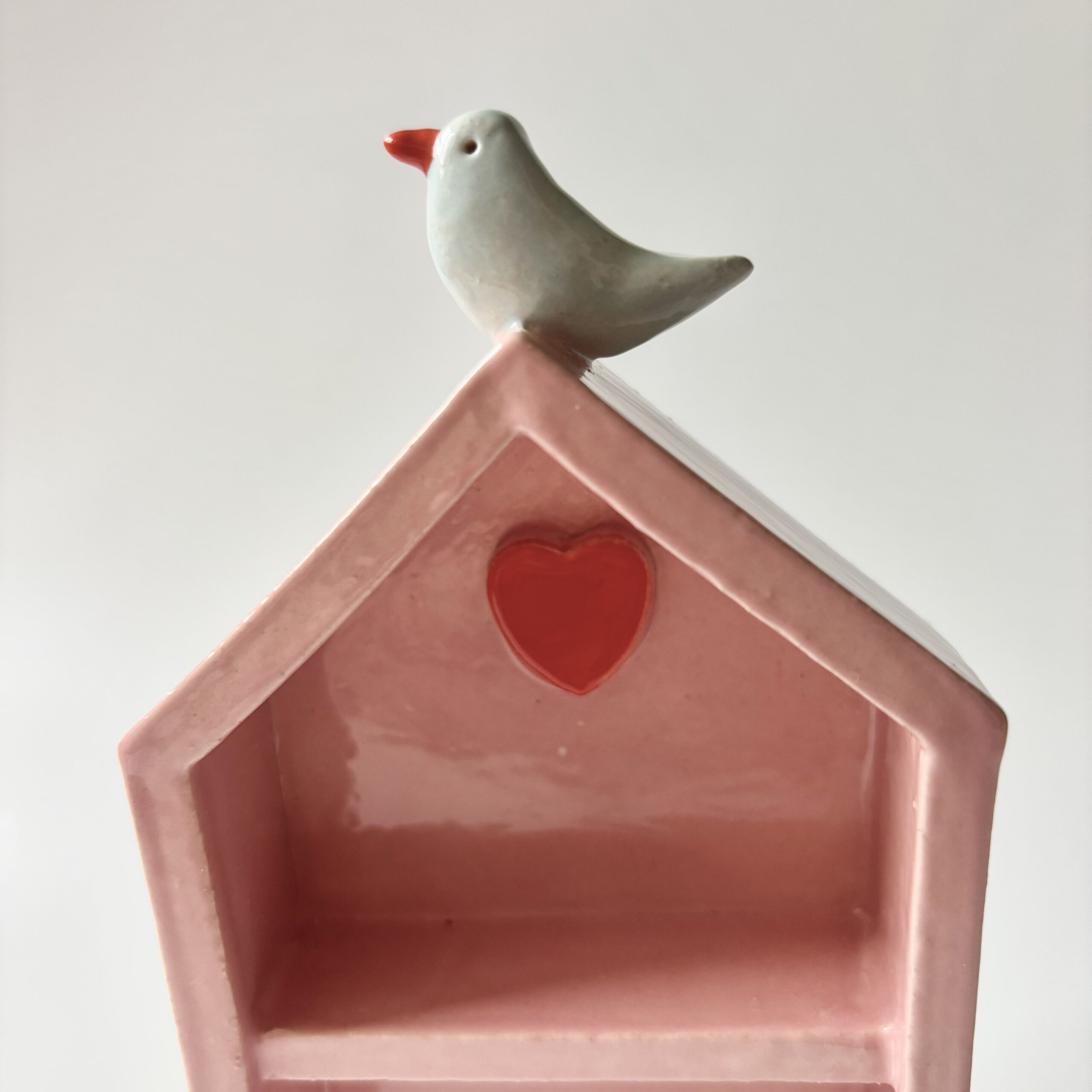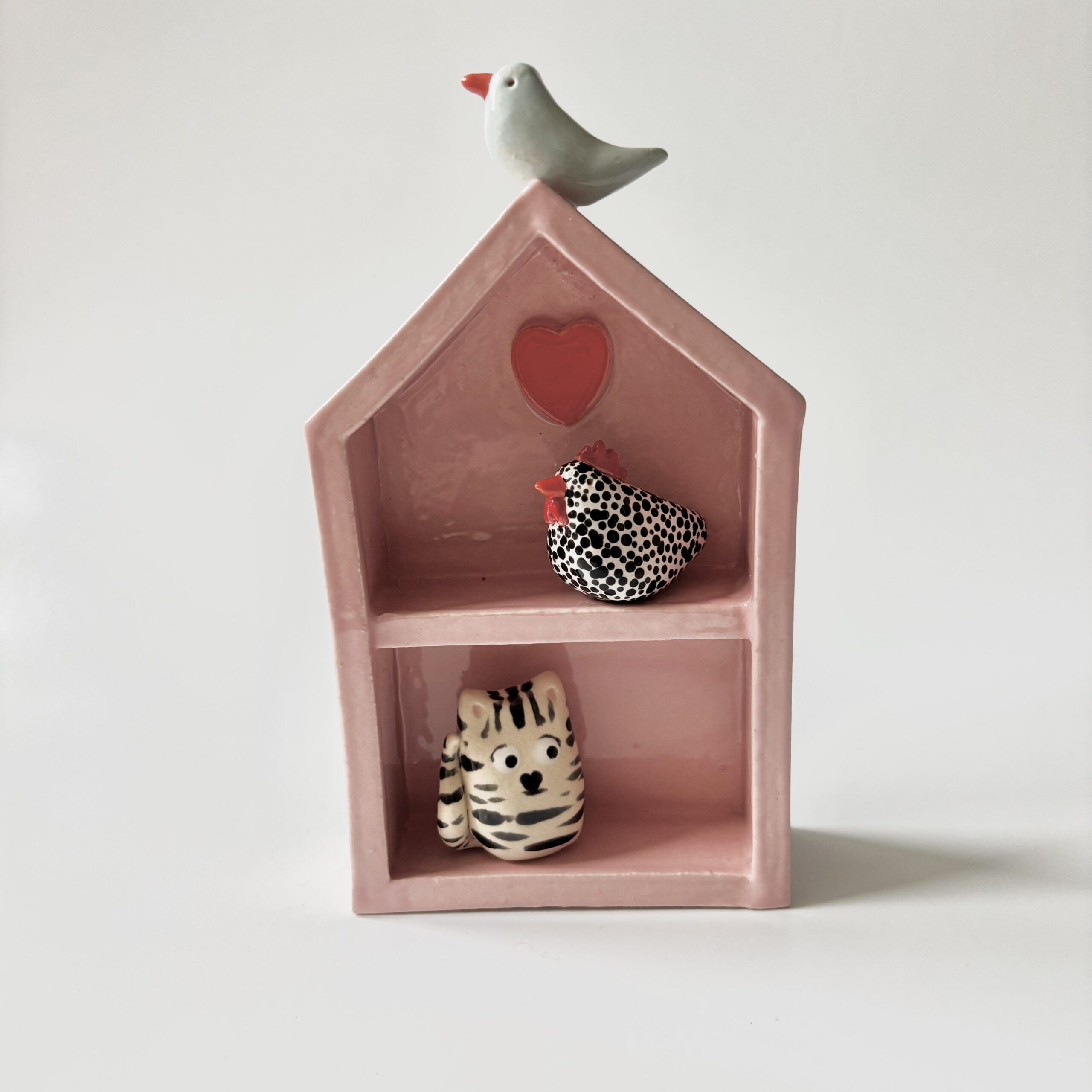 Dit huisje in roze met blauwe vogel heb ik met de hand gevormd en roze geglazuurd. Op het dak zit een blauw vogeltje. In het huisje heb ik een hartje van klei gemaakt en dat heb ik oranje geglazuurd. Zet het huisje neer en zet er je favoriete kleine hebbedingetjes in. Of bestel hier een klein katje om er in te zetten. Je hebt telkens een uniek exemplaar. Leuk als decoratie of als uniek cadeau!