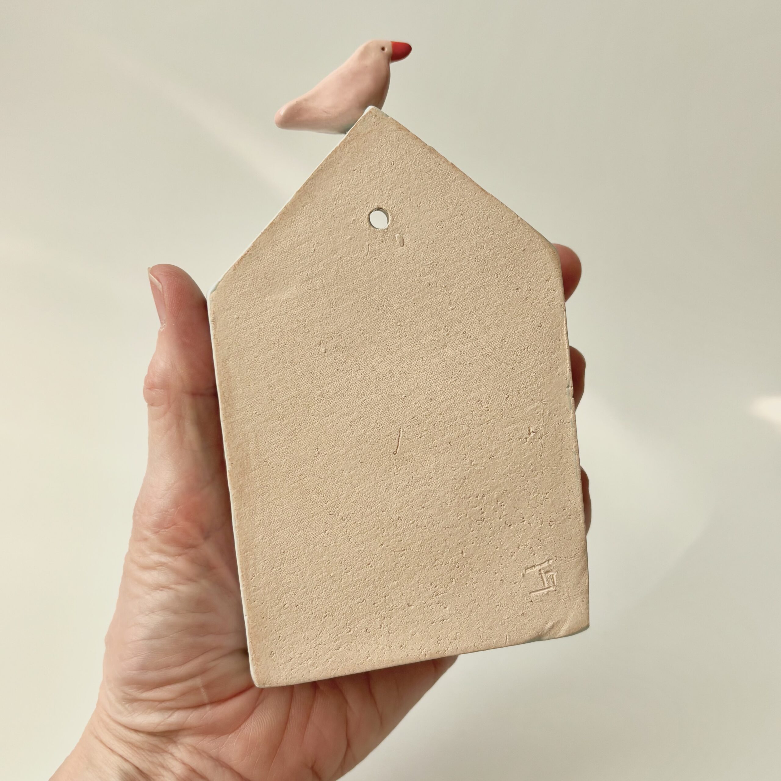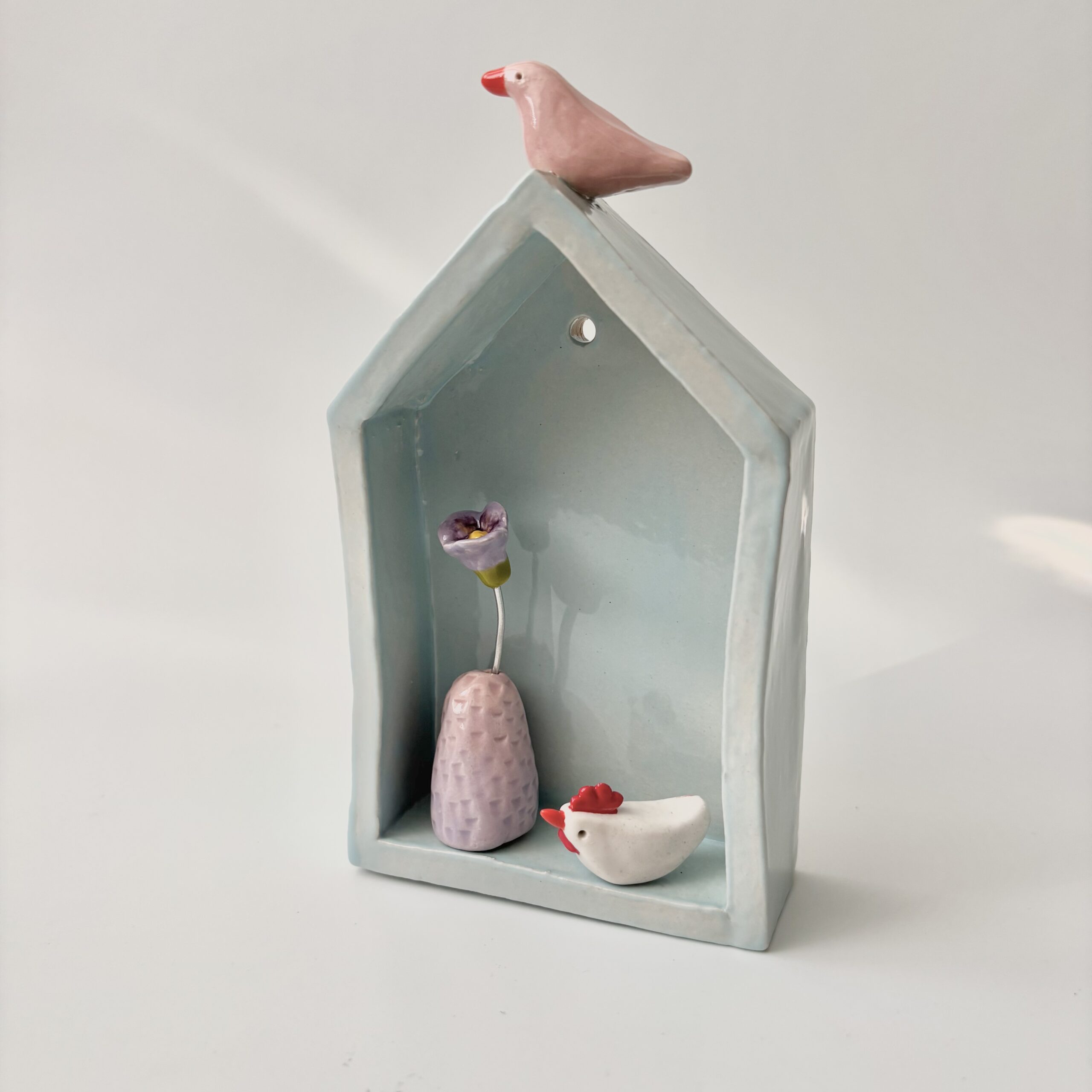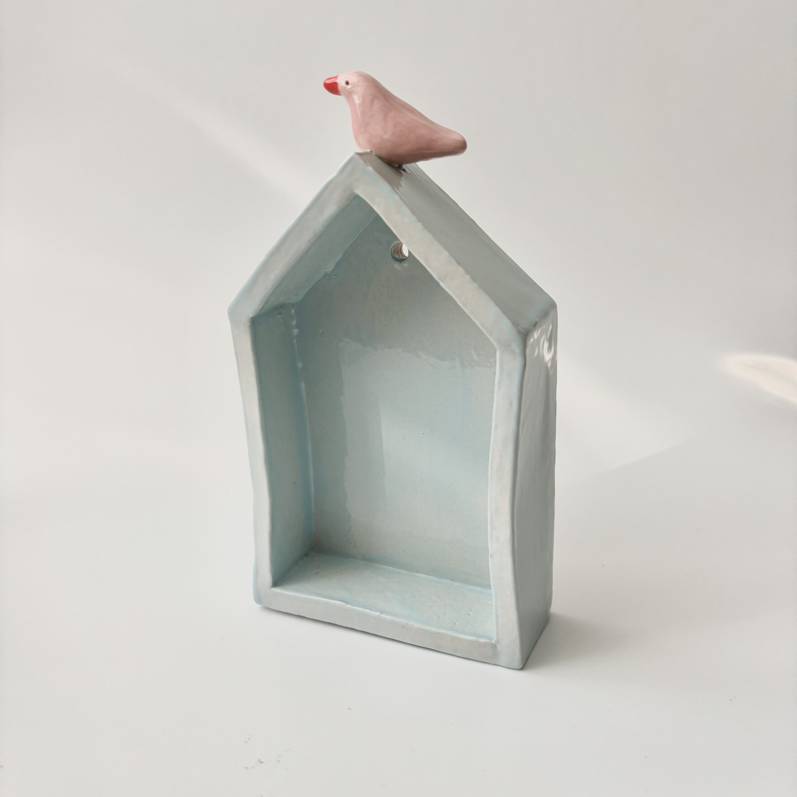 Dit huisje lichtblauw met roze vogel heb ik met de hand gevormd en lichtblauw geglazuurd. Op het dak zit een roze vogeltje. Hang het huisje aan de muur of zet het neer en zet er je favoriete kleine hebbedingetjes in. Of bestel hier een klein vaasje om er in te zetten. Je hebt telkens een uniek exemplaar. Leuk als decoratie of als uniek cadeau!