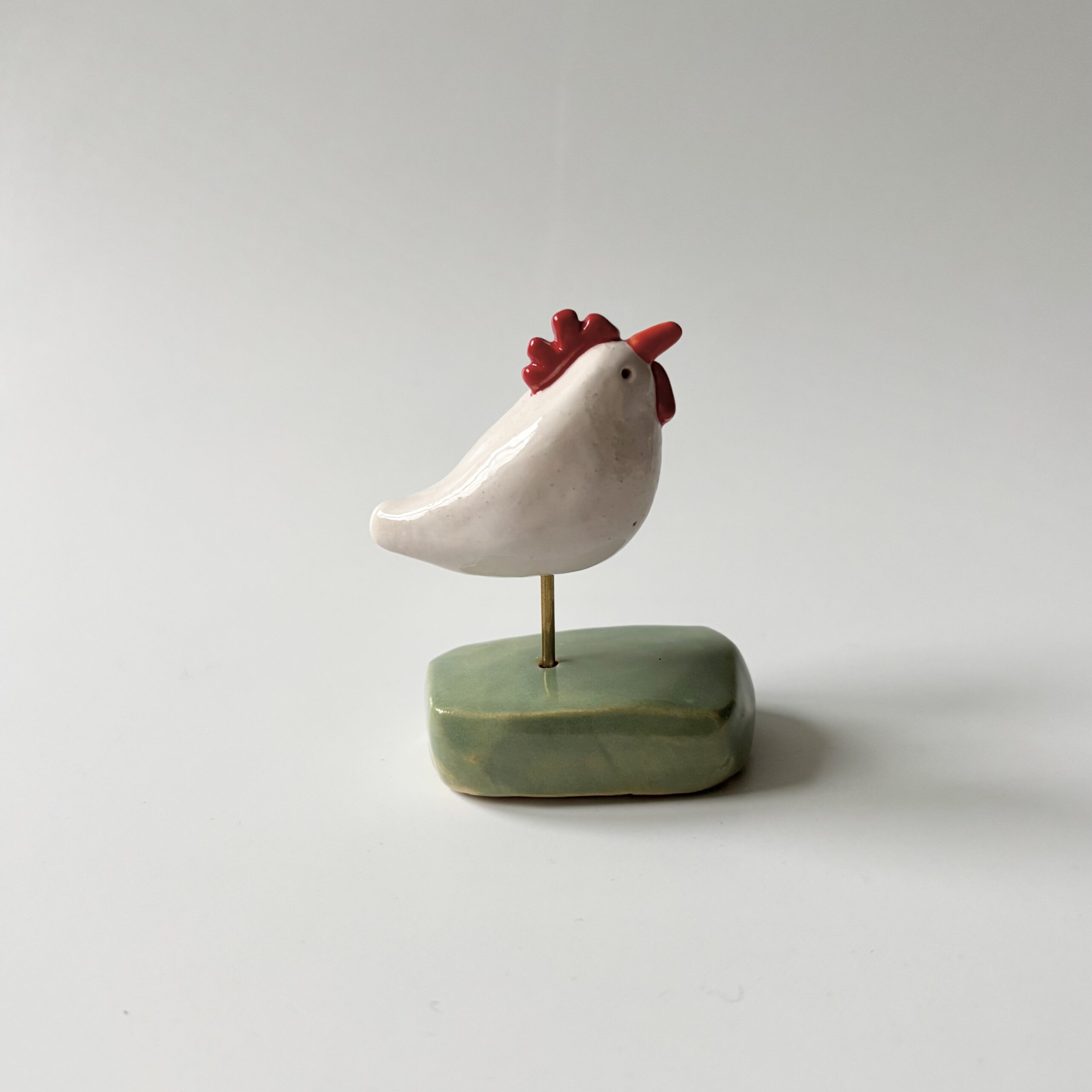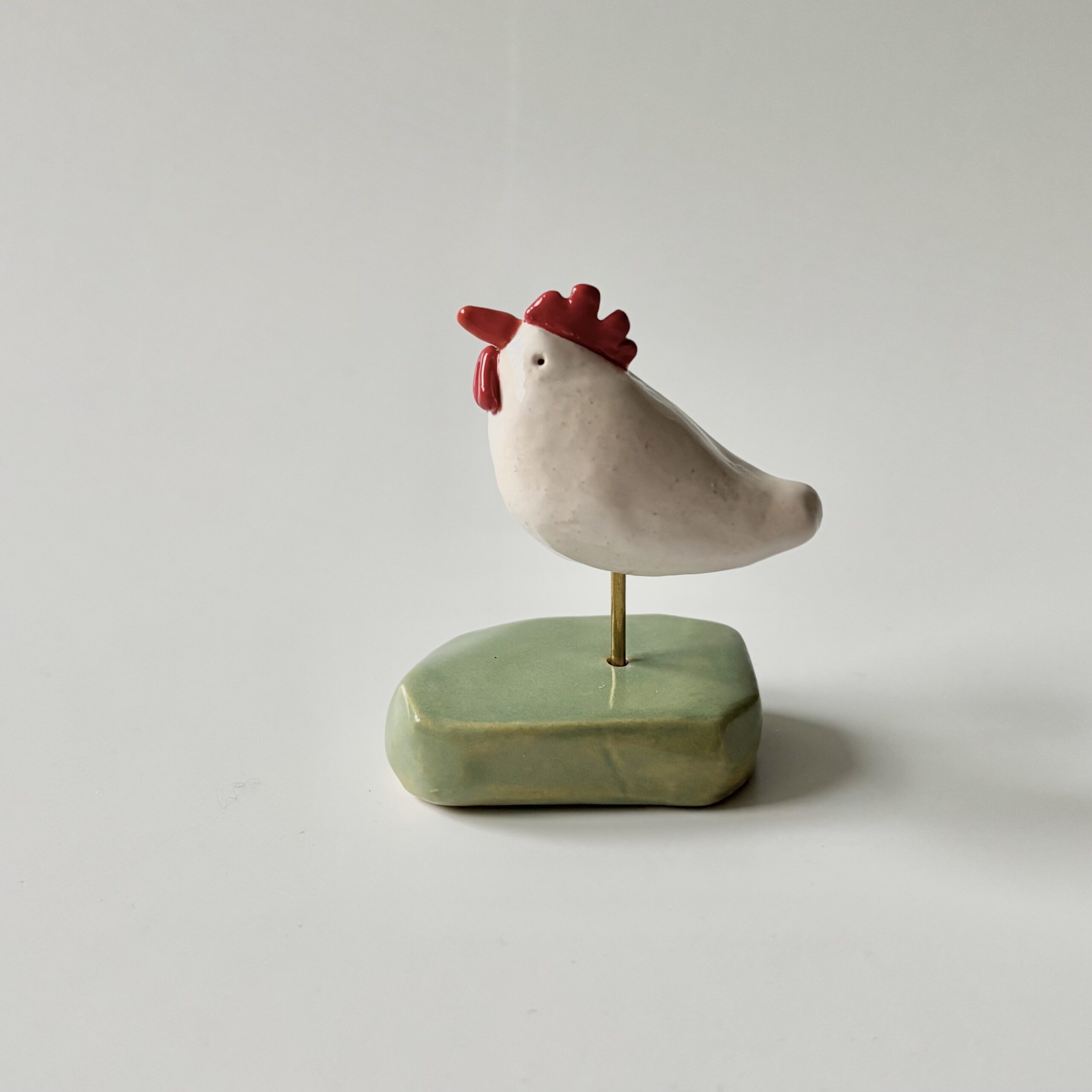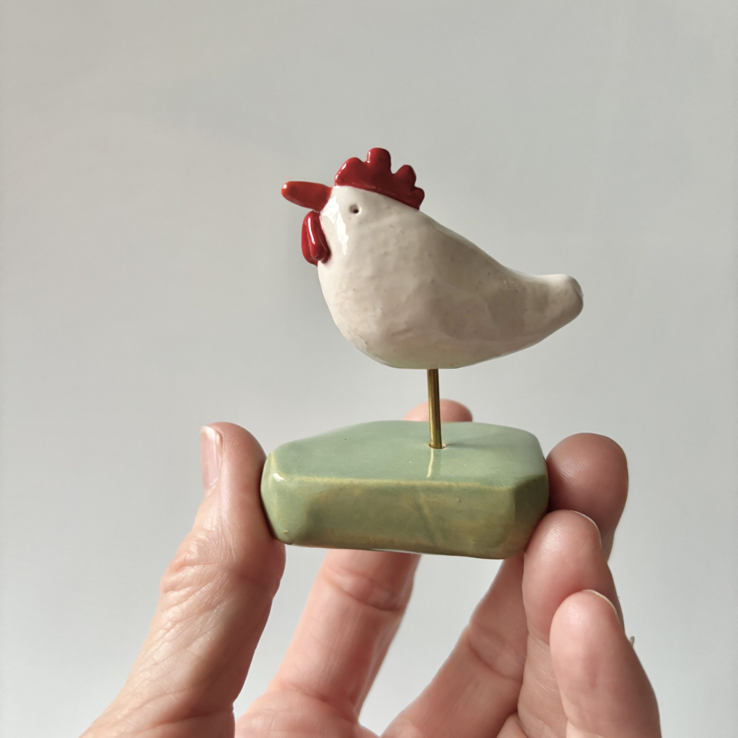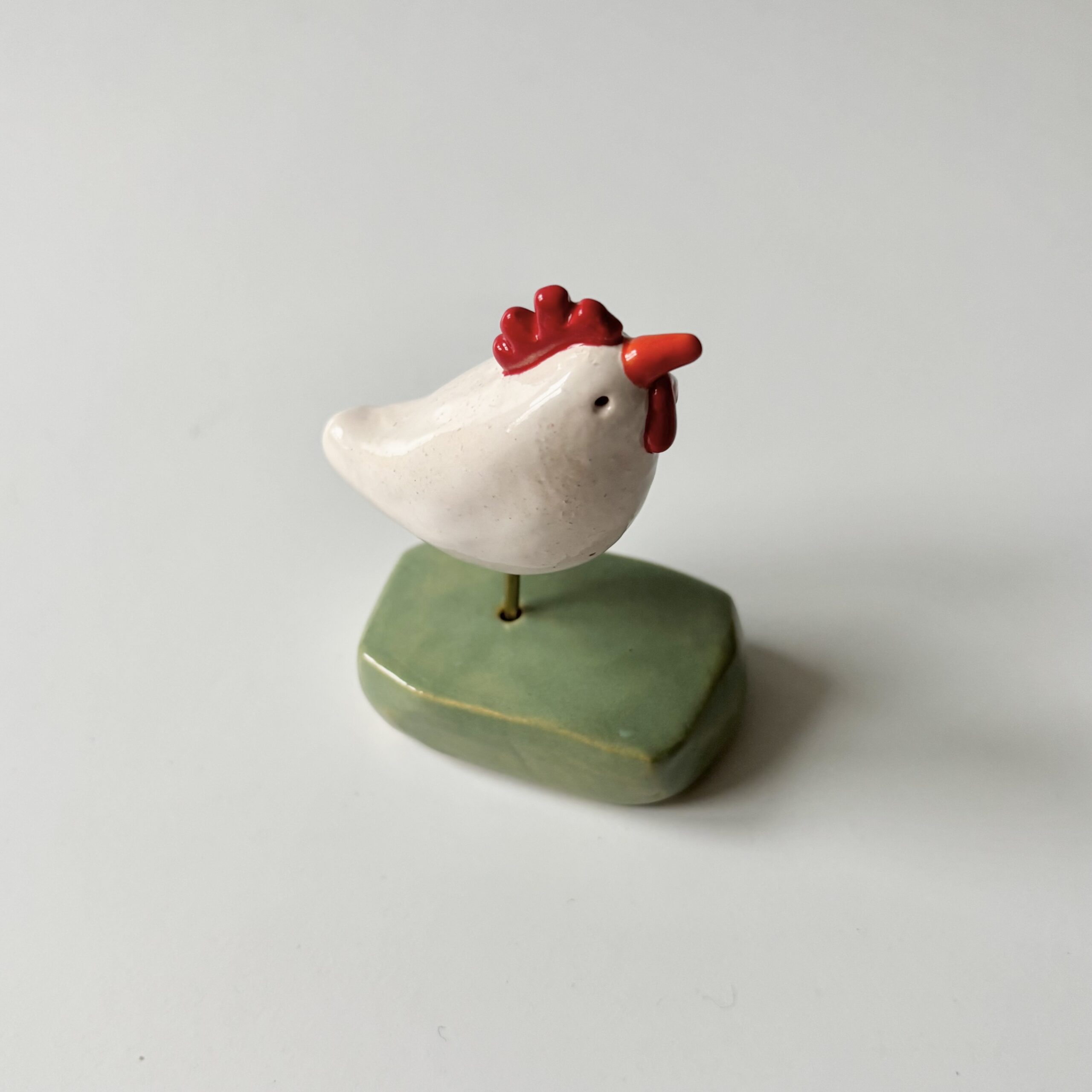 Ik heb de kip handgevormd, daarna heb ik ze wit geglazuurd en kammetje en lellen rood  Als laatste is de snavel oranje geworden. Het blokje waarop ze staat heb ik ook handgevormd en zacht groen geglazuurd.