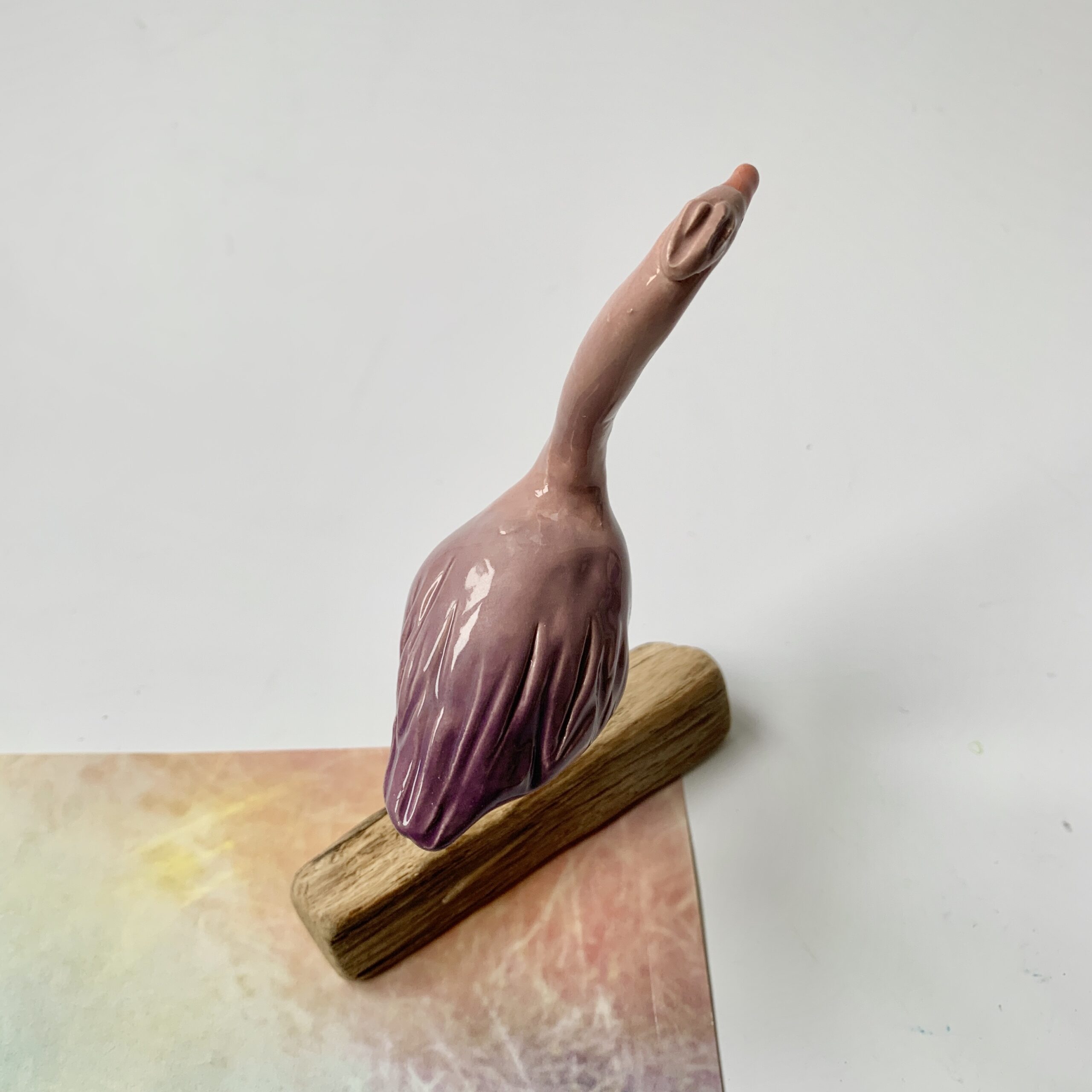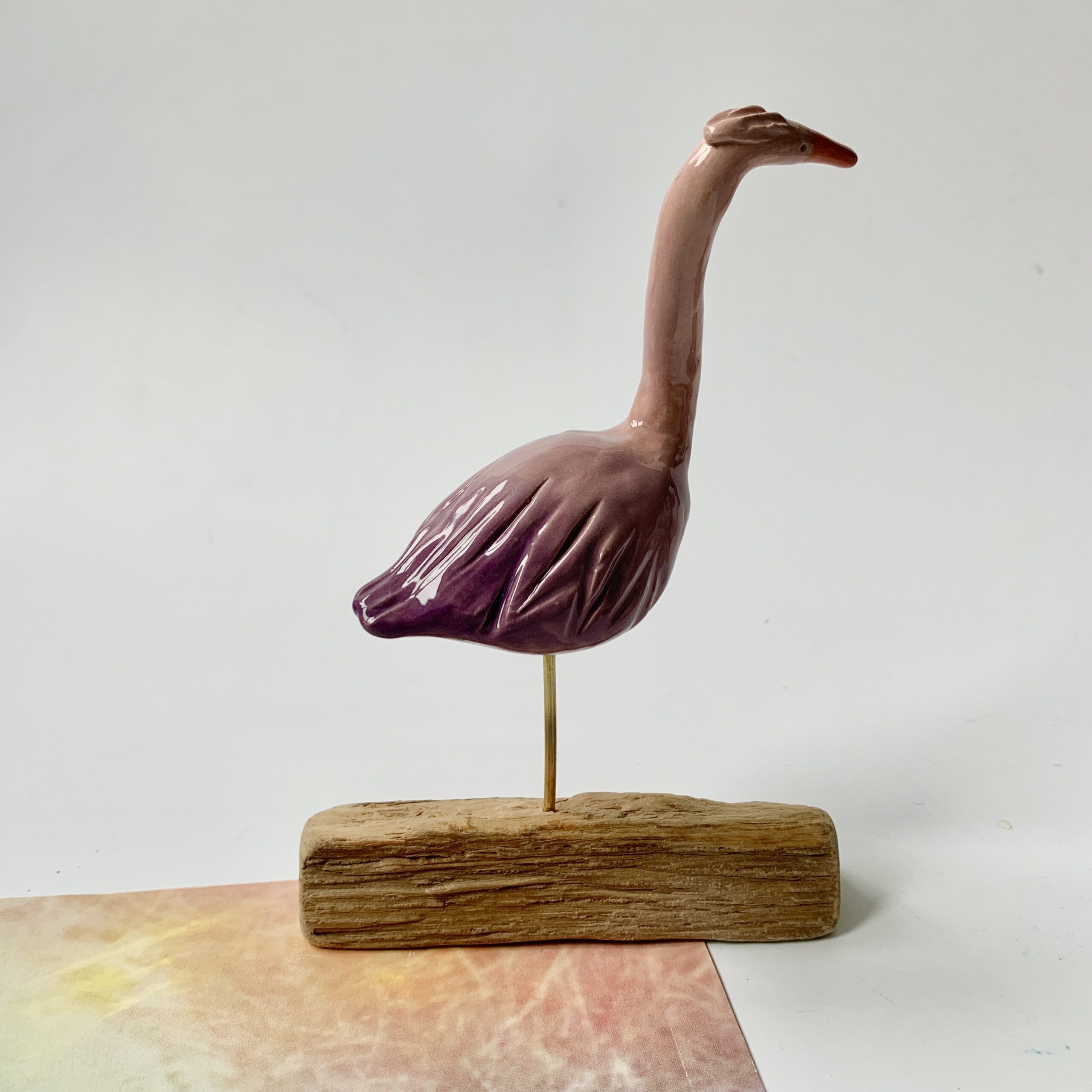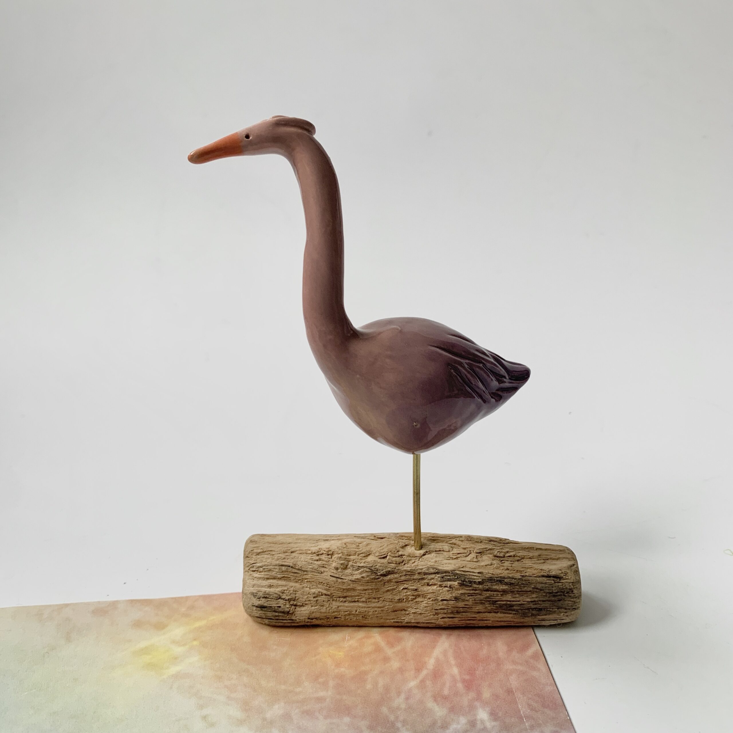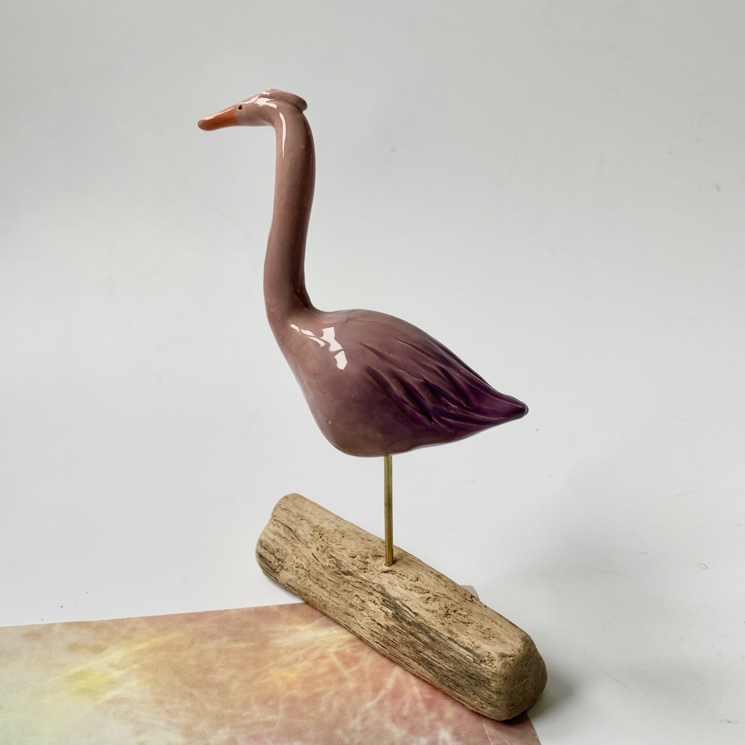Deze paars roze reiger van keramiek heb ik met de hand gevormd en geglazuurd in een verloop van roze naar paarse glazuur. Een uniek cadeau voor jezelf of iemand anders, die natuurliefhebber, vogelaar of vogelverzamelaar. Er is maar één uniek exemplaar van deze reiger. Hij staat op een metalen pootje dat is vast gezet in een stukje drijfhout.