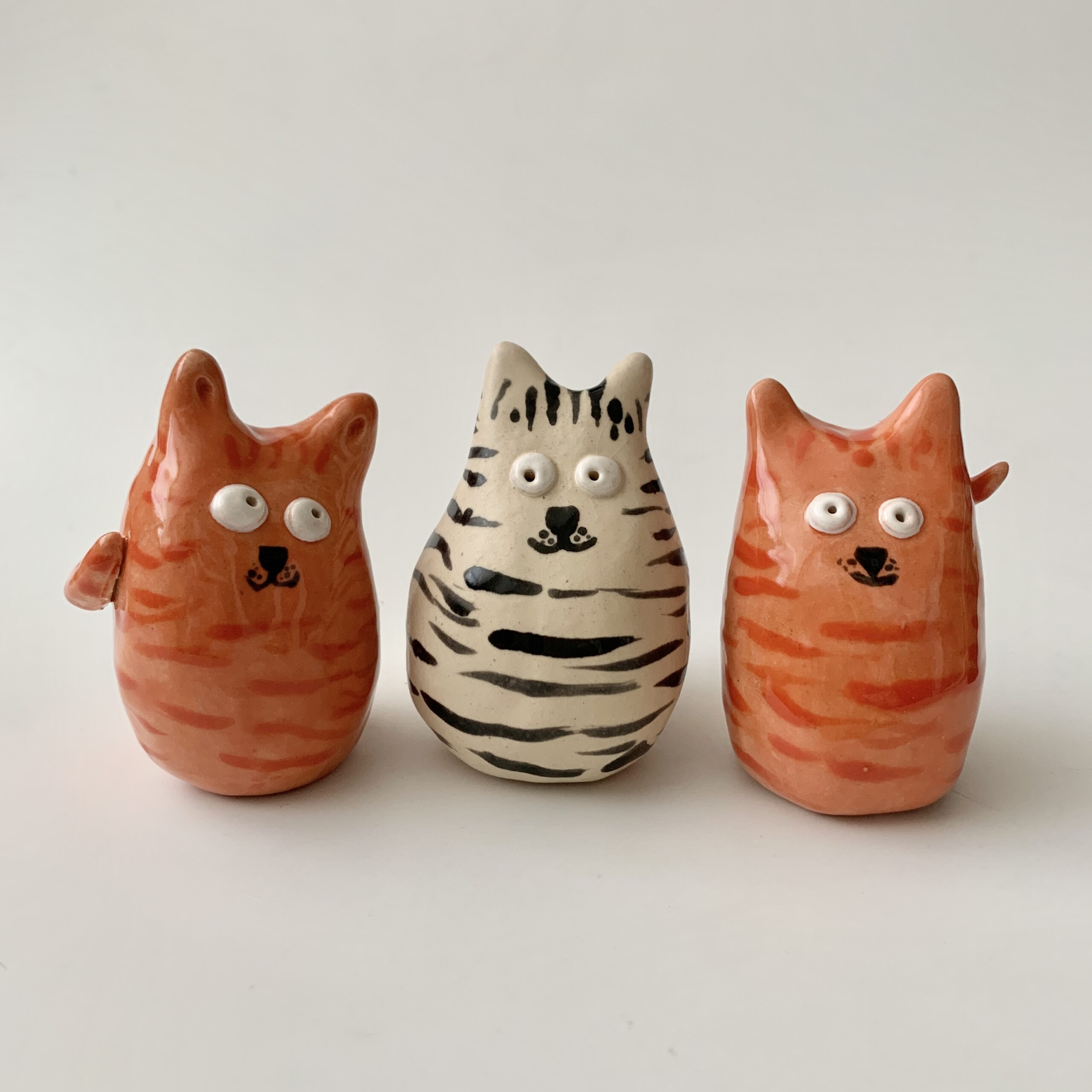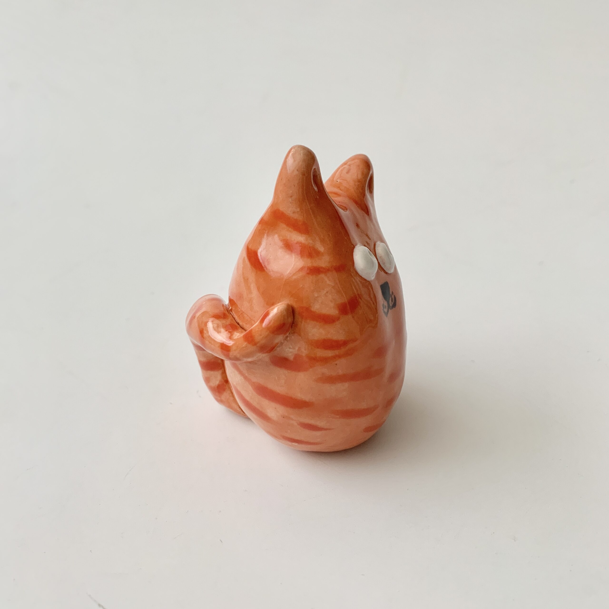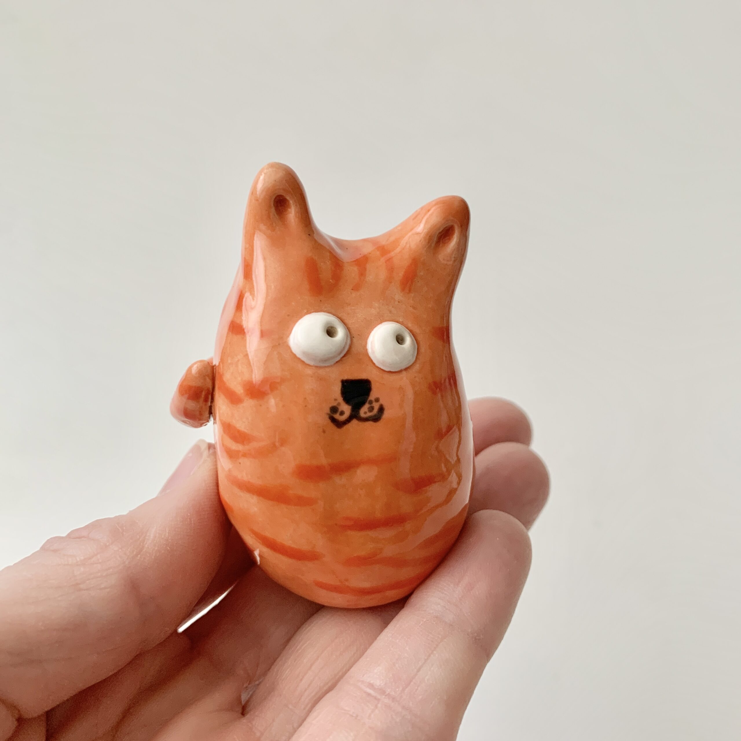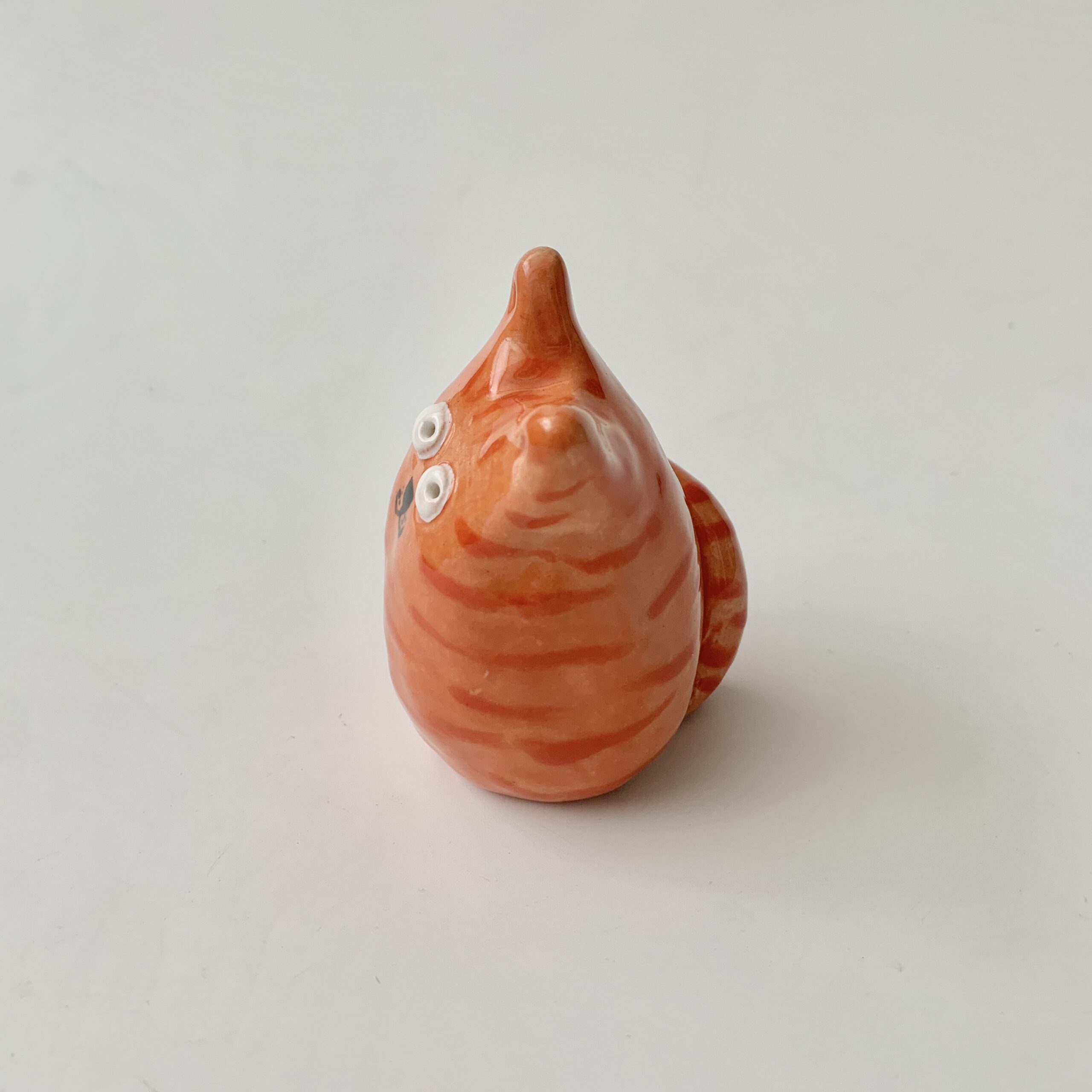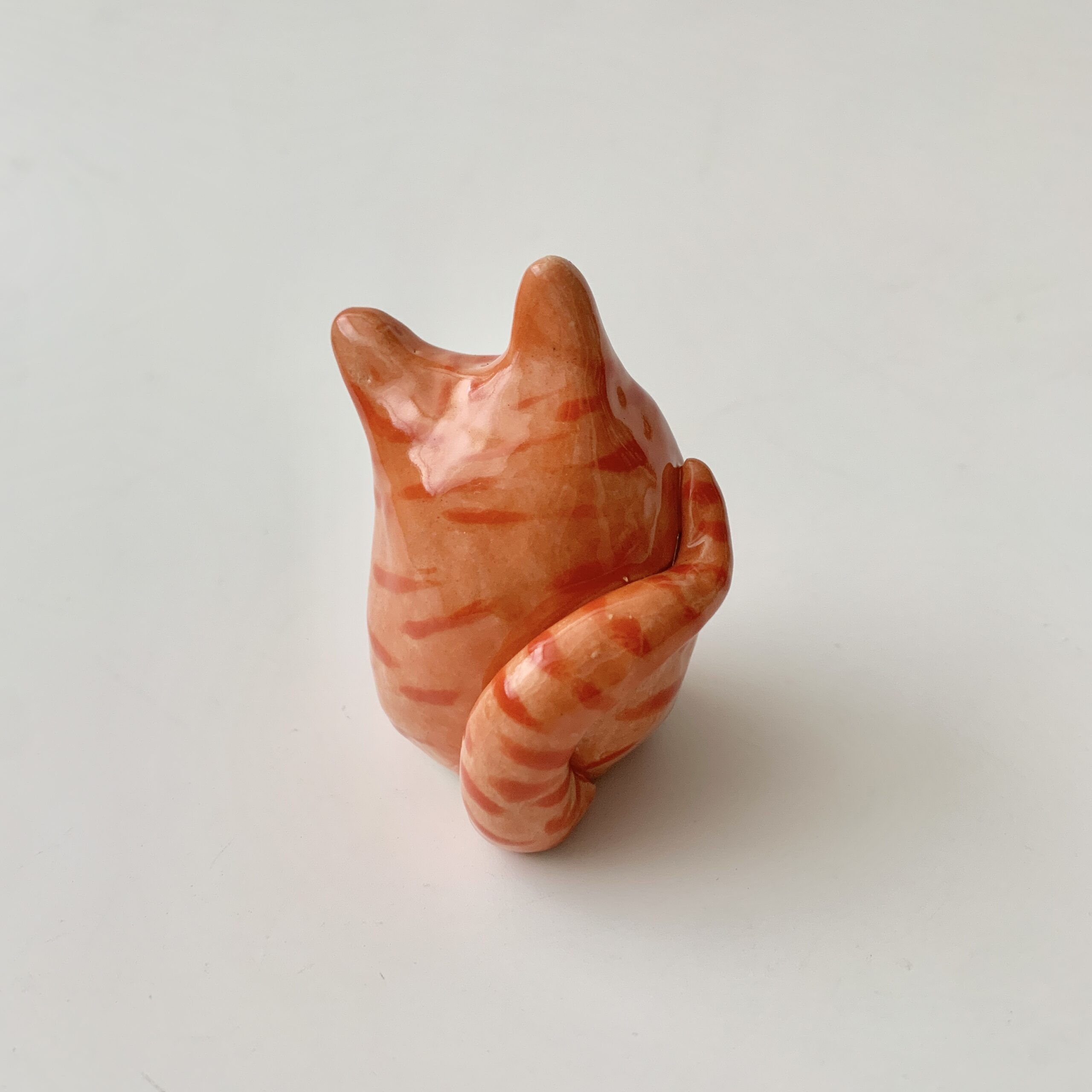 Ik heb het katje met de hand gevormd, daarna heb ik het lichtoranje geglazuurd en heb ik er met donkere oranje glazuur strepen op geschilderd. Daardoor is deze unieke kat ontstaan.