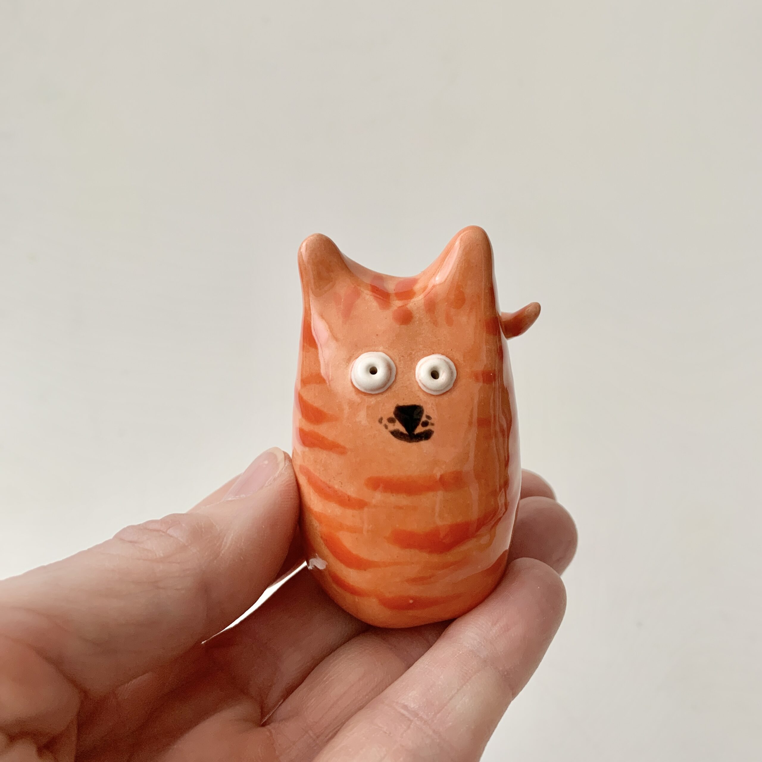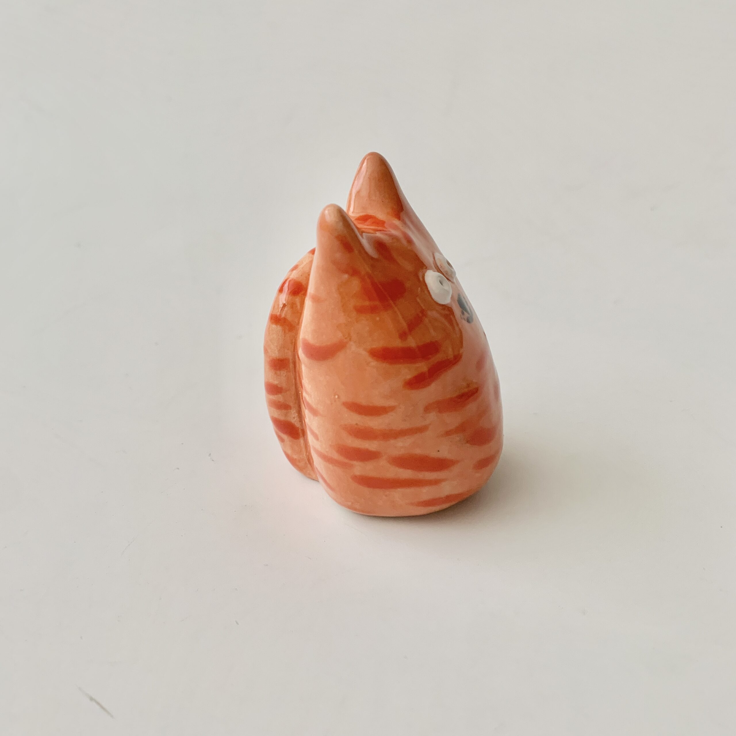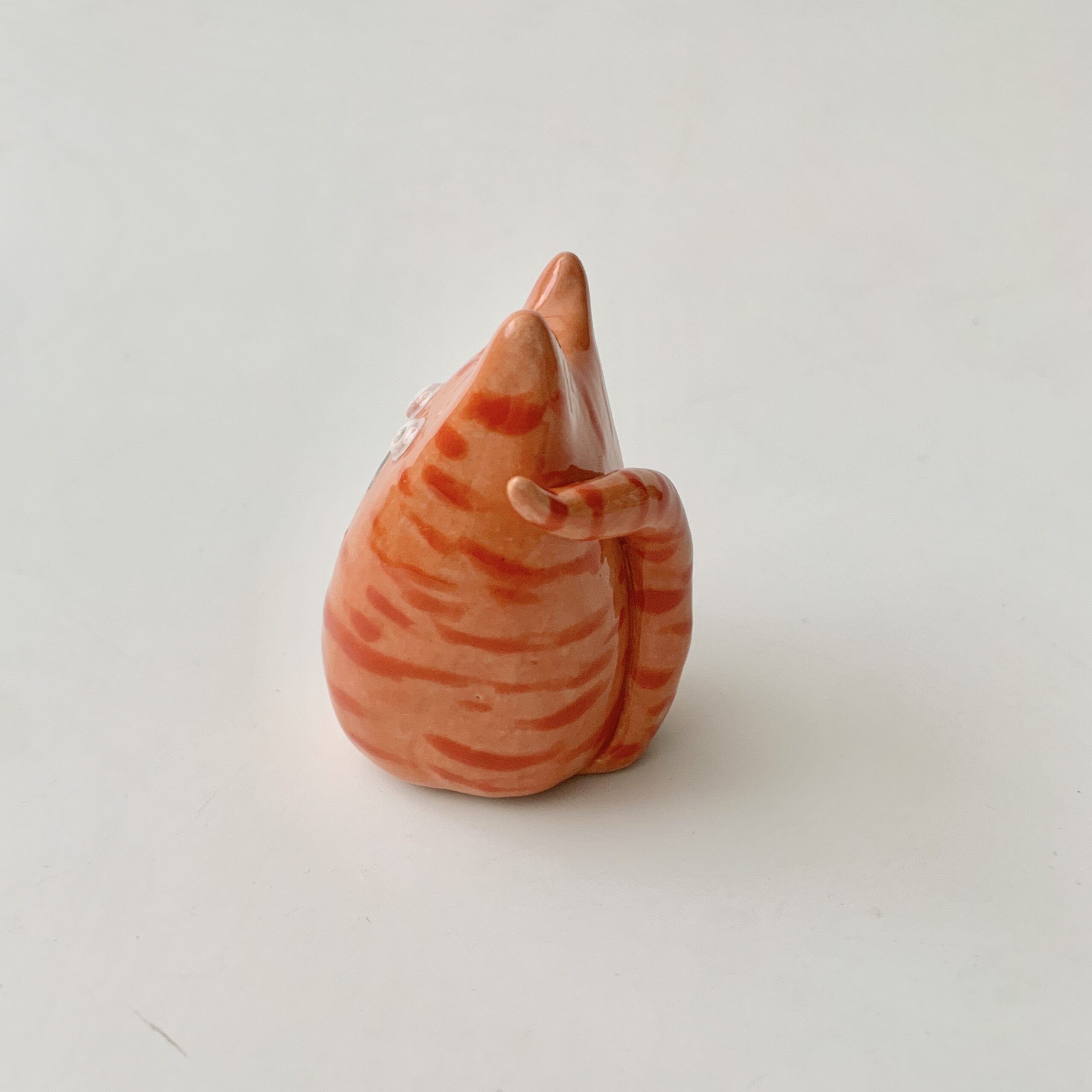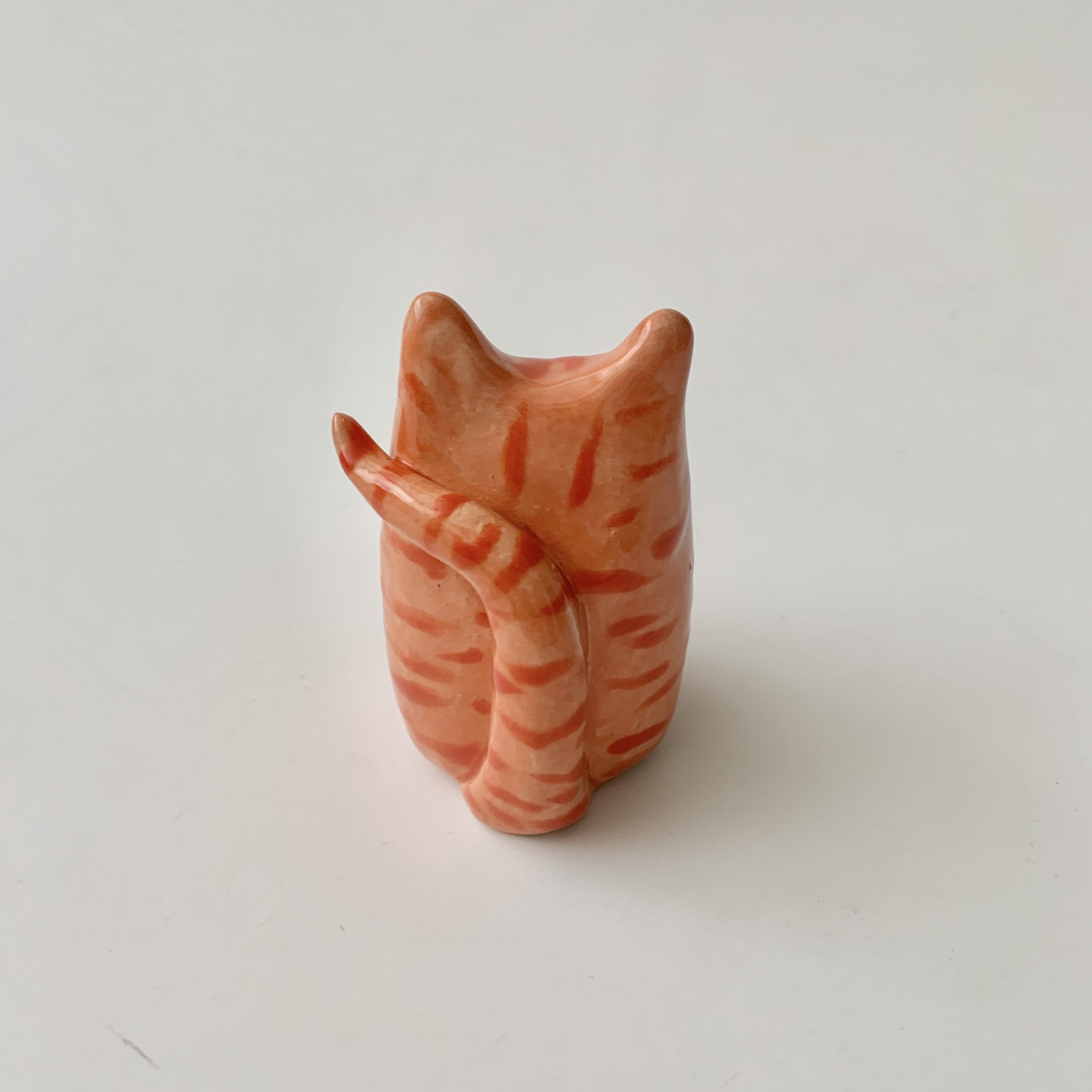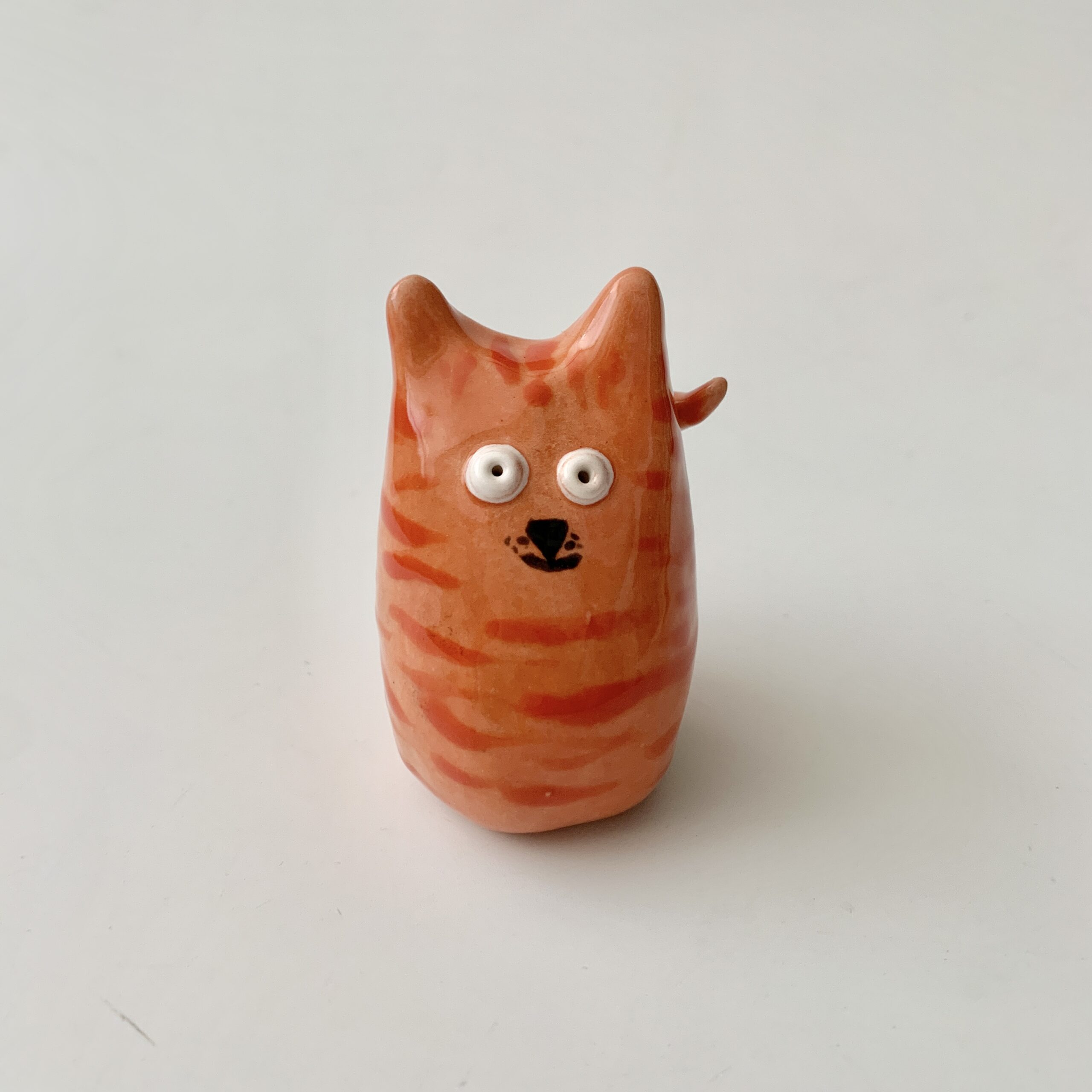 Ik heb het katje met de hand gevormd, daarna heb ik het lichtoranje geglazuurd en heb ik er met donkere oranje glazuur strepen op geschilderd. Daardoor is deze unieke kater ontstaan.