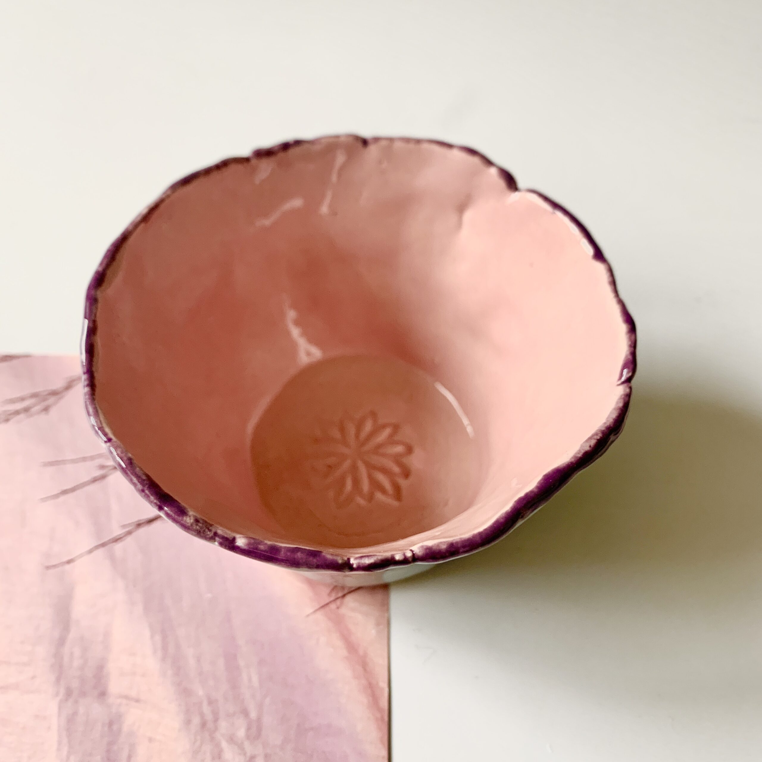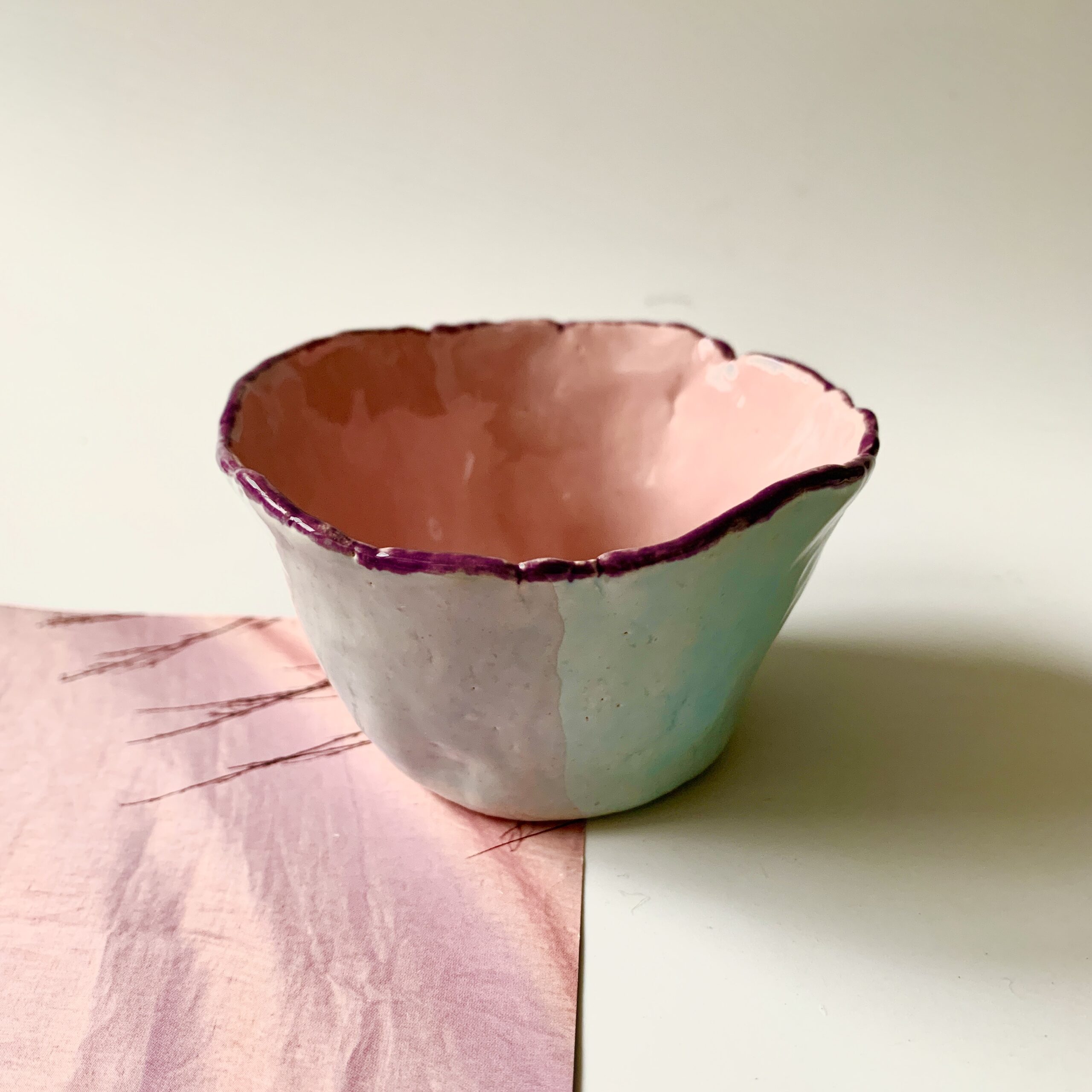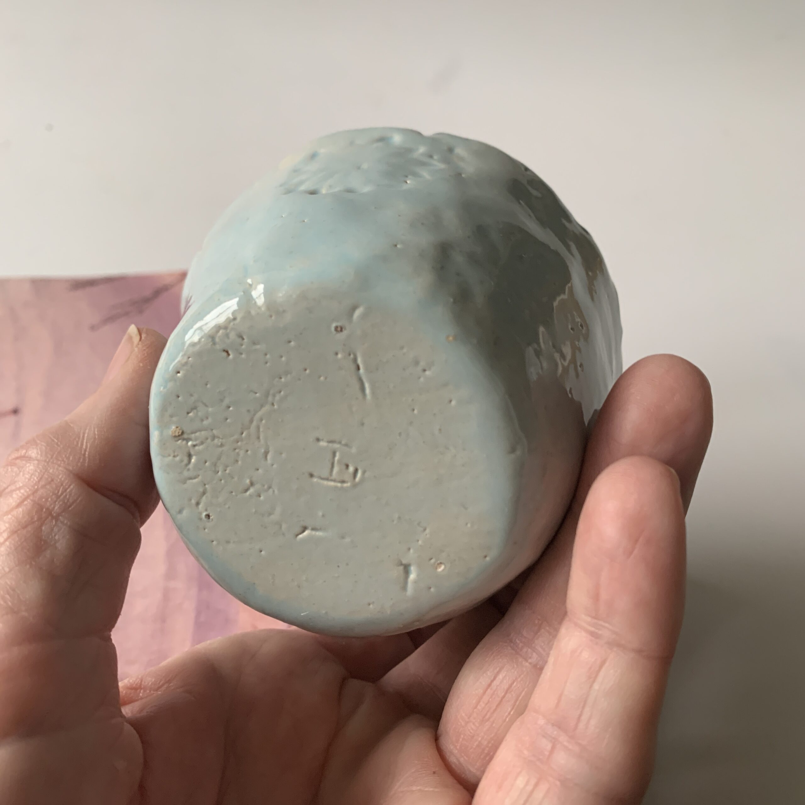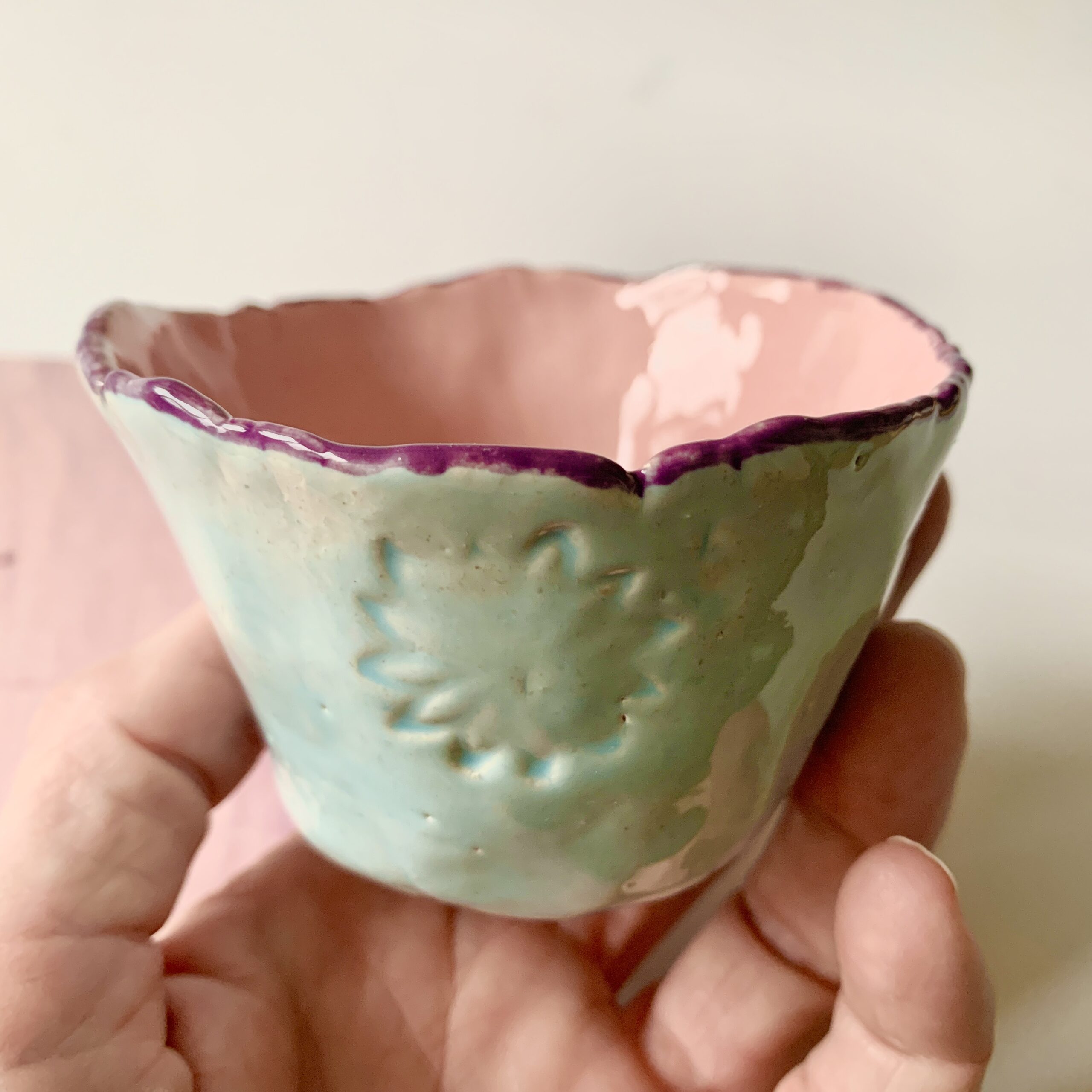 Dit keramieken vaasje/ potje lichtblauw roze heb ik helemaal handgevormd en daarna aan de buitenkant geglazuurd met een lichtblauwe glazuur die mooi contrasteert met de roze geglazuurde binnenkant. Daarna heb ik het randje met een paarse glazuur geschilderd. Het is een uniek cadeautje voor een dierbaar iemand