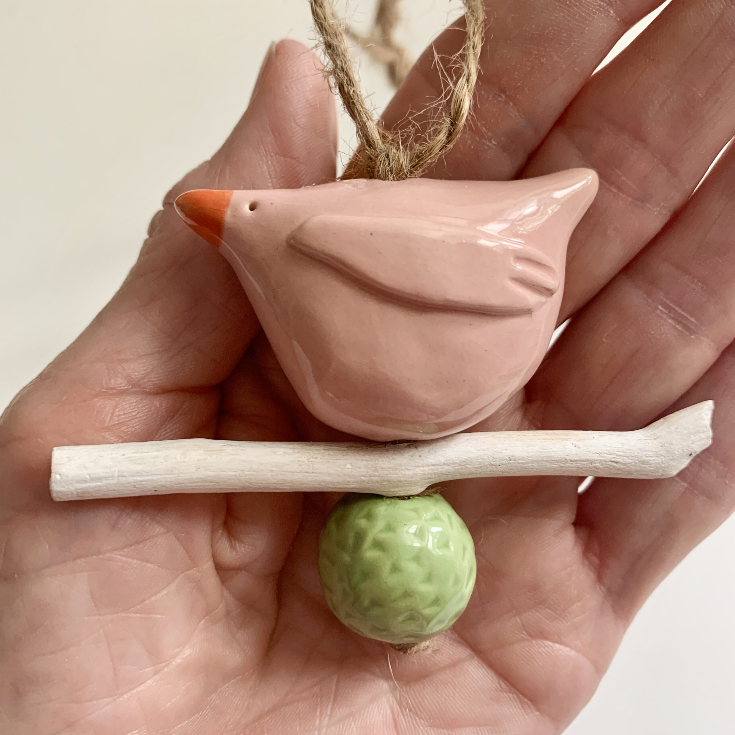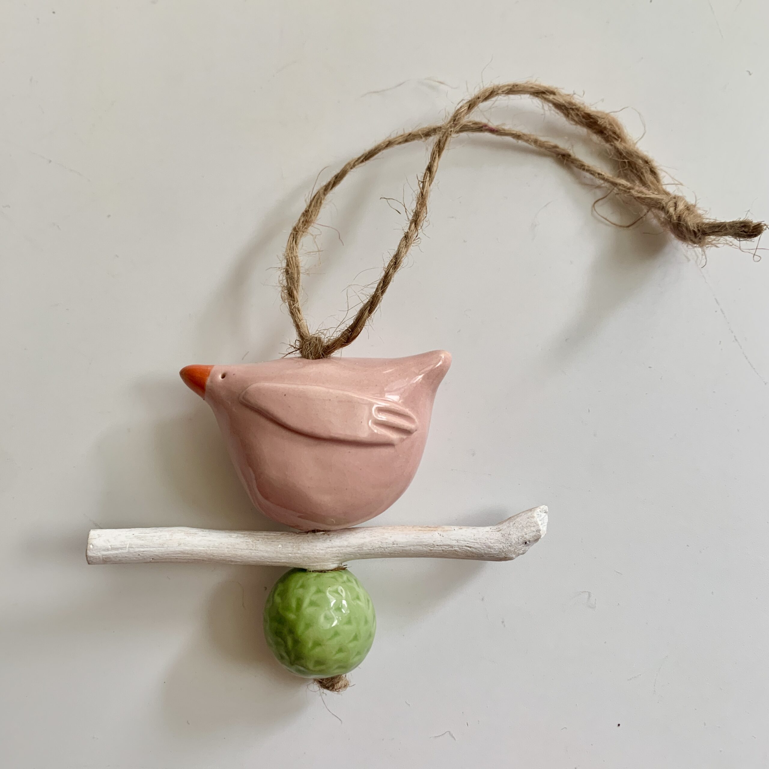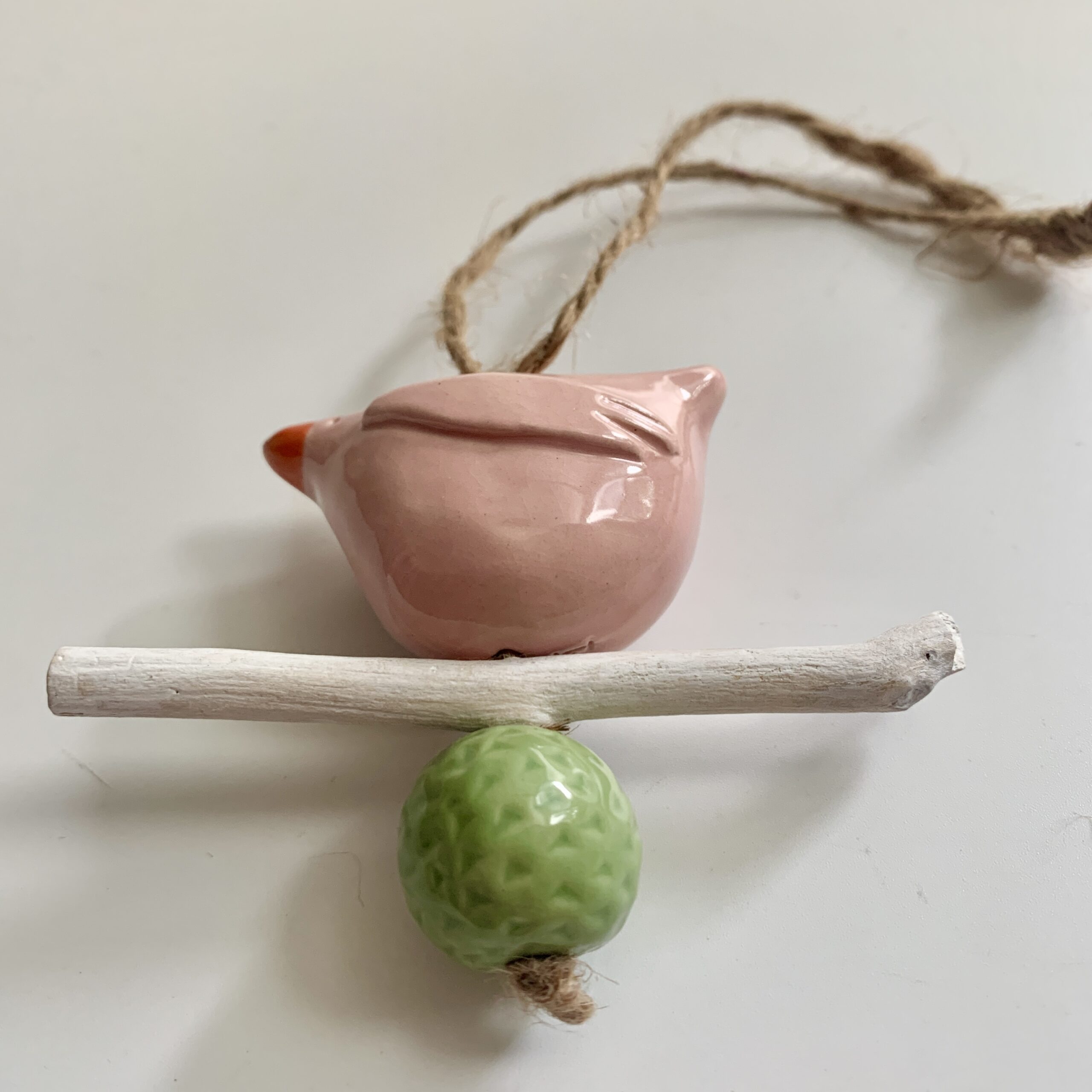 Vogel hanger roze van keramiek op een stokje. Ik heb de vogel handgevormd. Daarna heb ik hem geglazuurd in roze. De kraal heb ik ook handgemaakt en geglazuurd in groen. Ik heb een stokje, dat ik tijdens mijn wandelingen vind, wit geschilderd en het geheel samen gevoegd. Hierdoor is deze unieke hanger ontstaan. Een unieke decoratie voor dat speciale hoekje, voor op de baby- of kinderkamer of om cadeau te geven. Ook leuk als kraamcadeau!