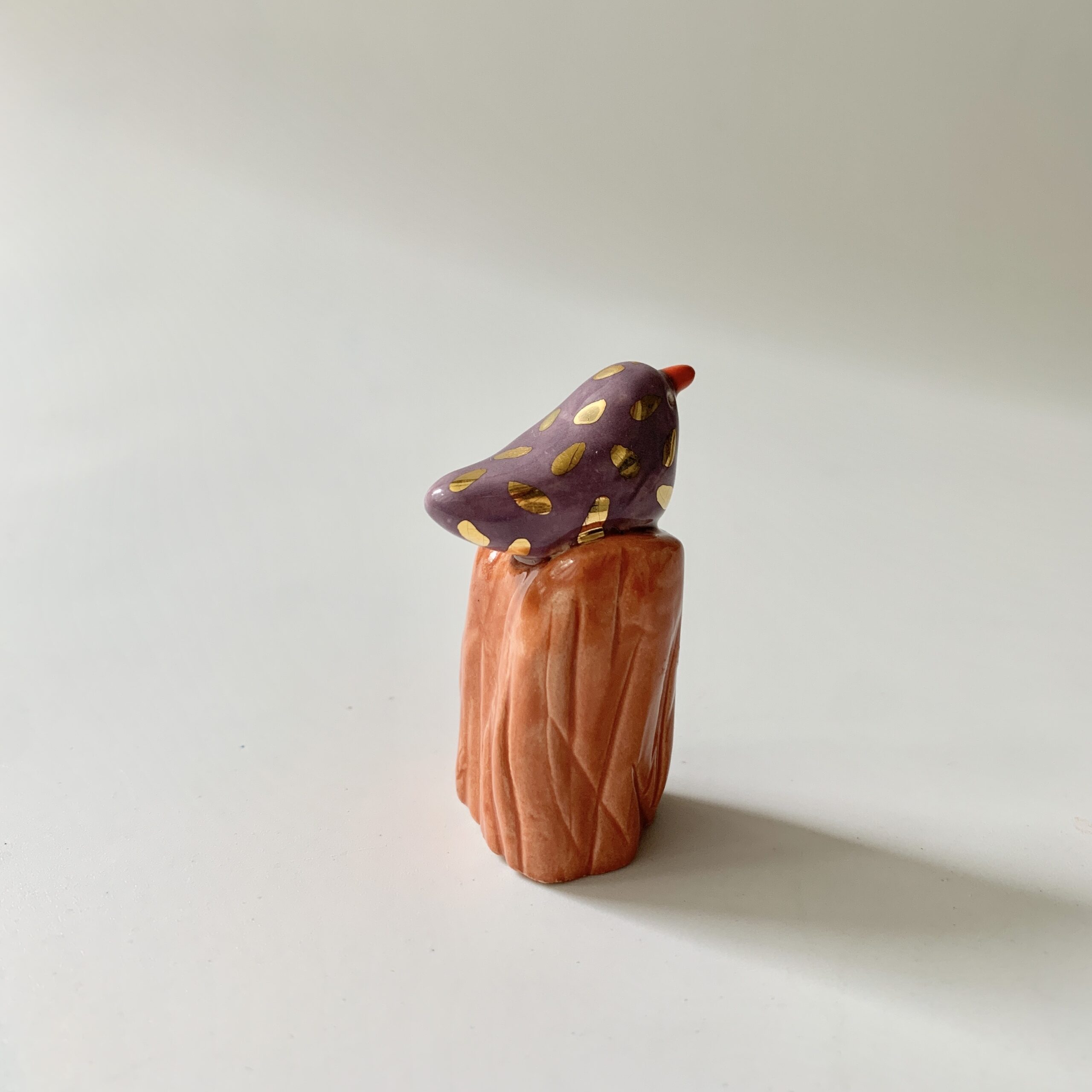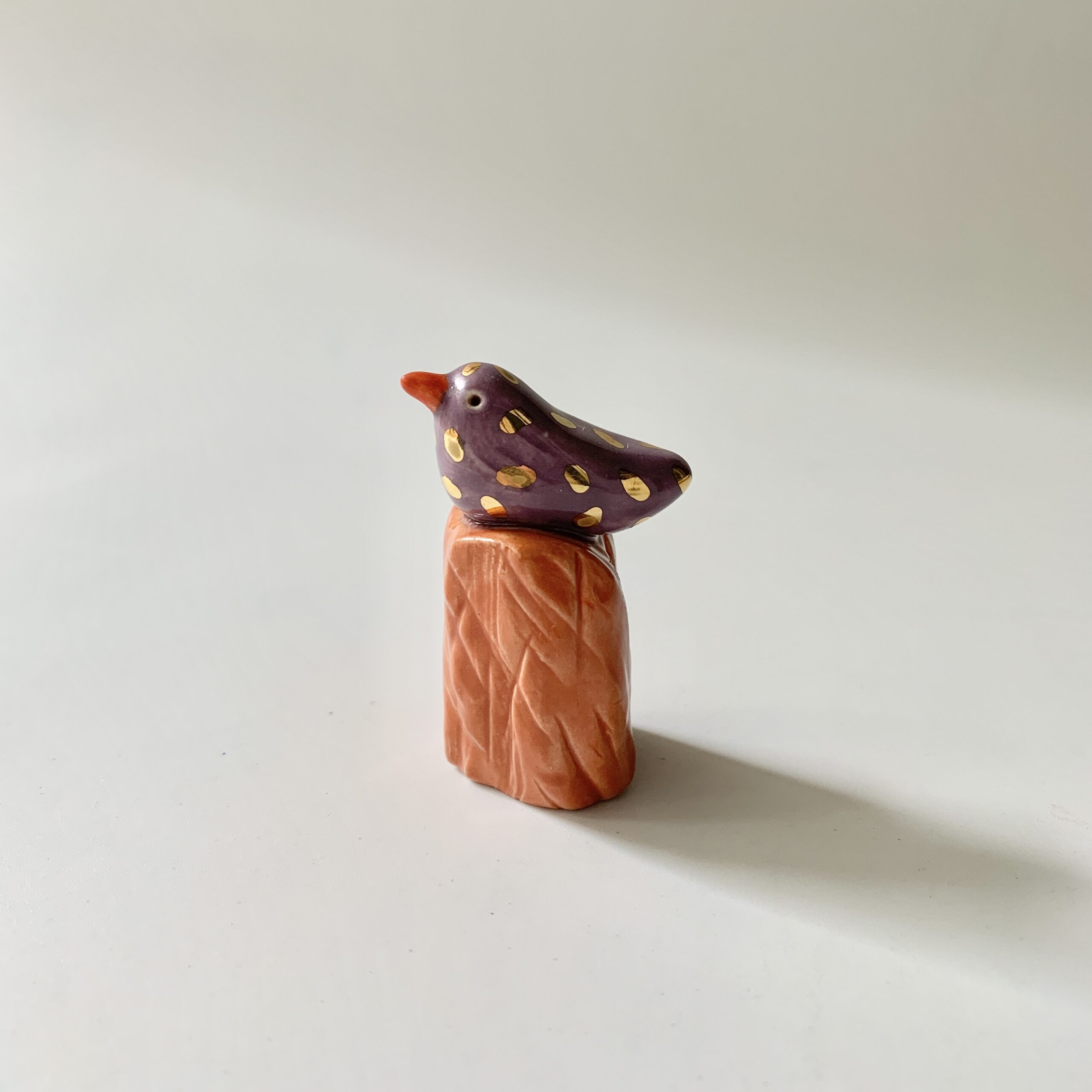 Vogel paars met goud op bruin stammetje van keramiek. Ik heb deze vogel met de hand gevormd en ook het stammetje heb ik hand gevormd. Daarna heb ik hem geglazuurd met een paarse glazuur en het stammetje heb ik een bruine kleur gegeven. Als laatste heb ik de vogel met goudluster versierd, waarna hij nog een keer in de keramiekoven is gegaan. Een uniek cadeau voor jezelf of iemand anders, die lieverd die wat extra aandacht verdient of die vogelverzamelaar. Er is maar één uniek exemplaar.