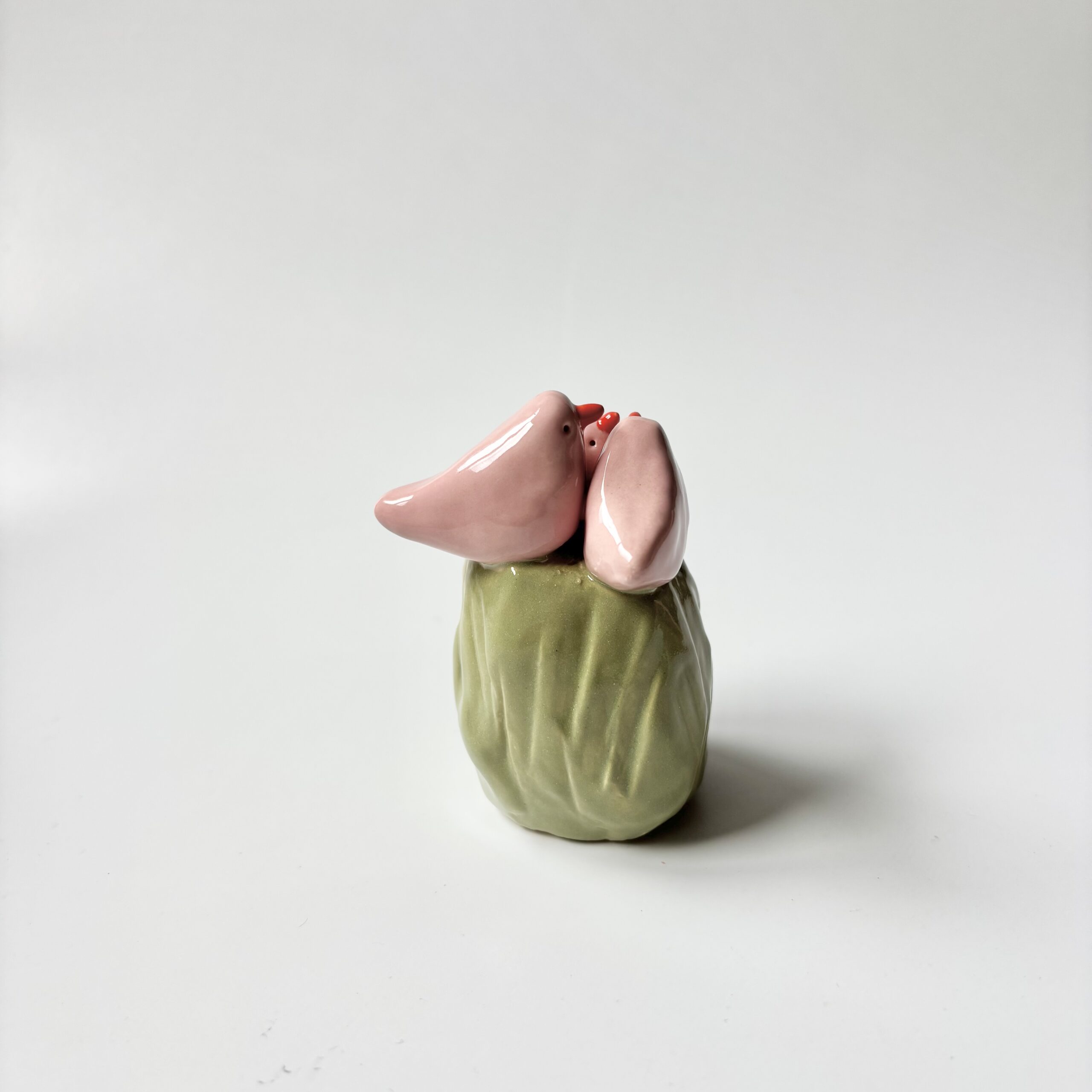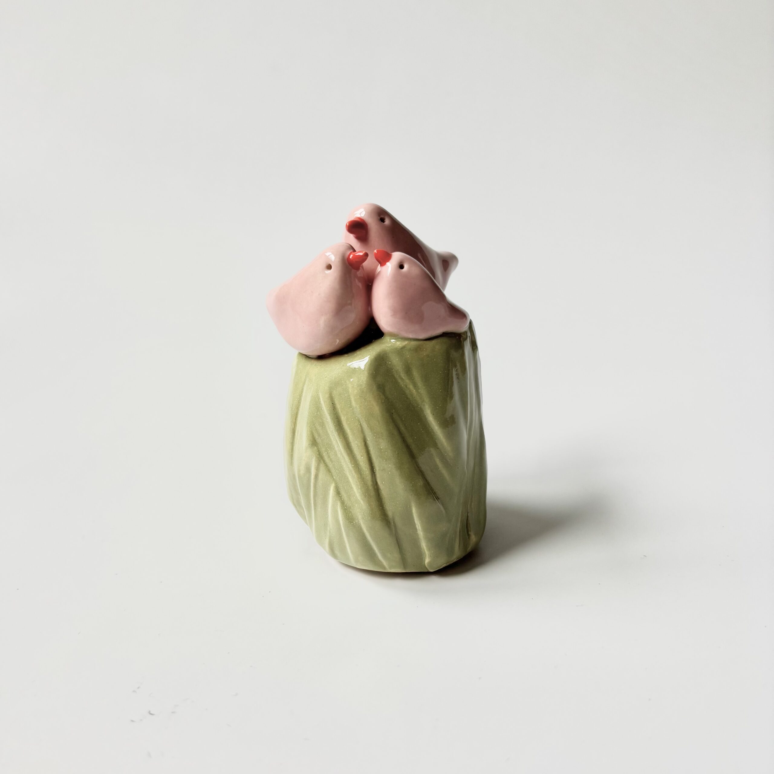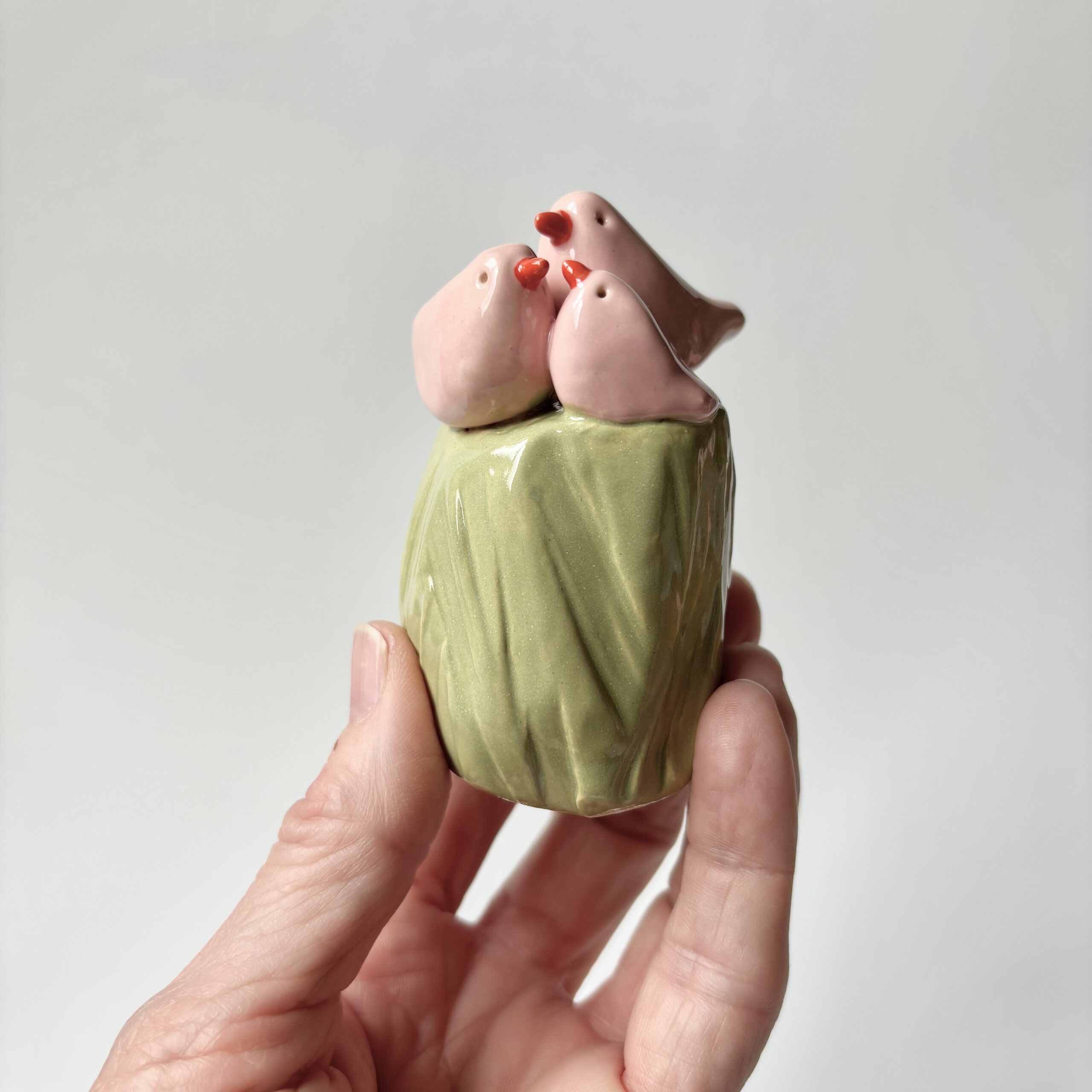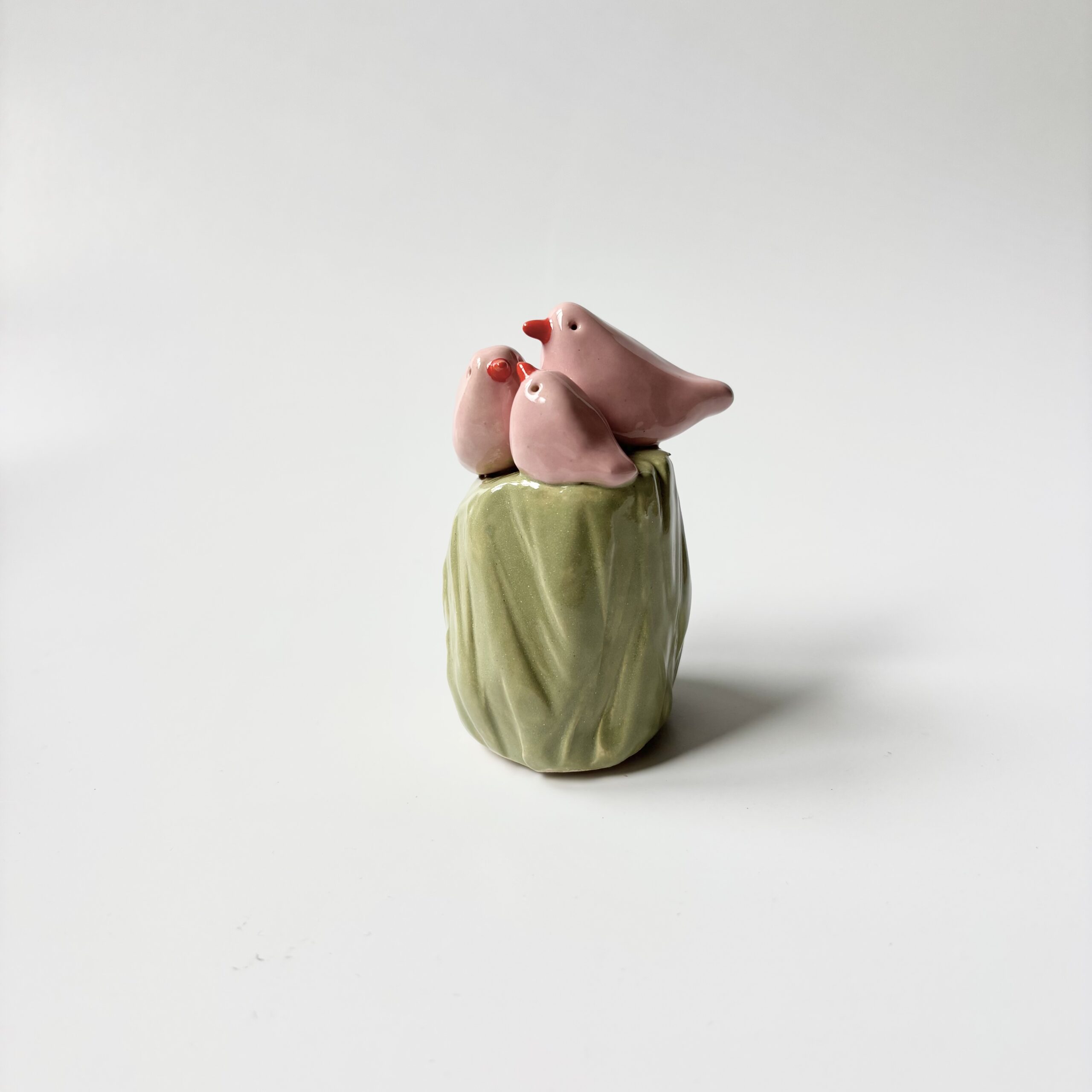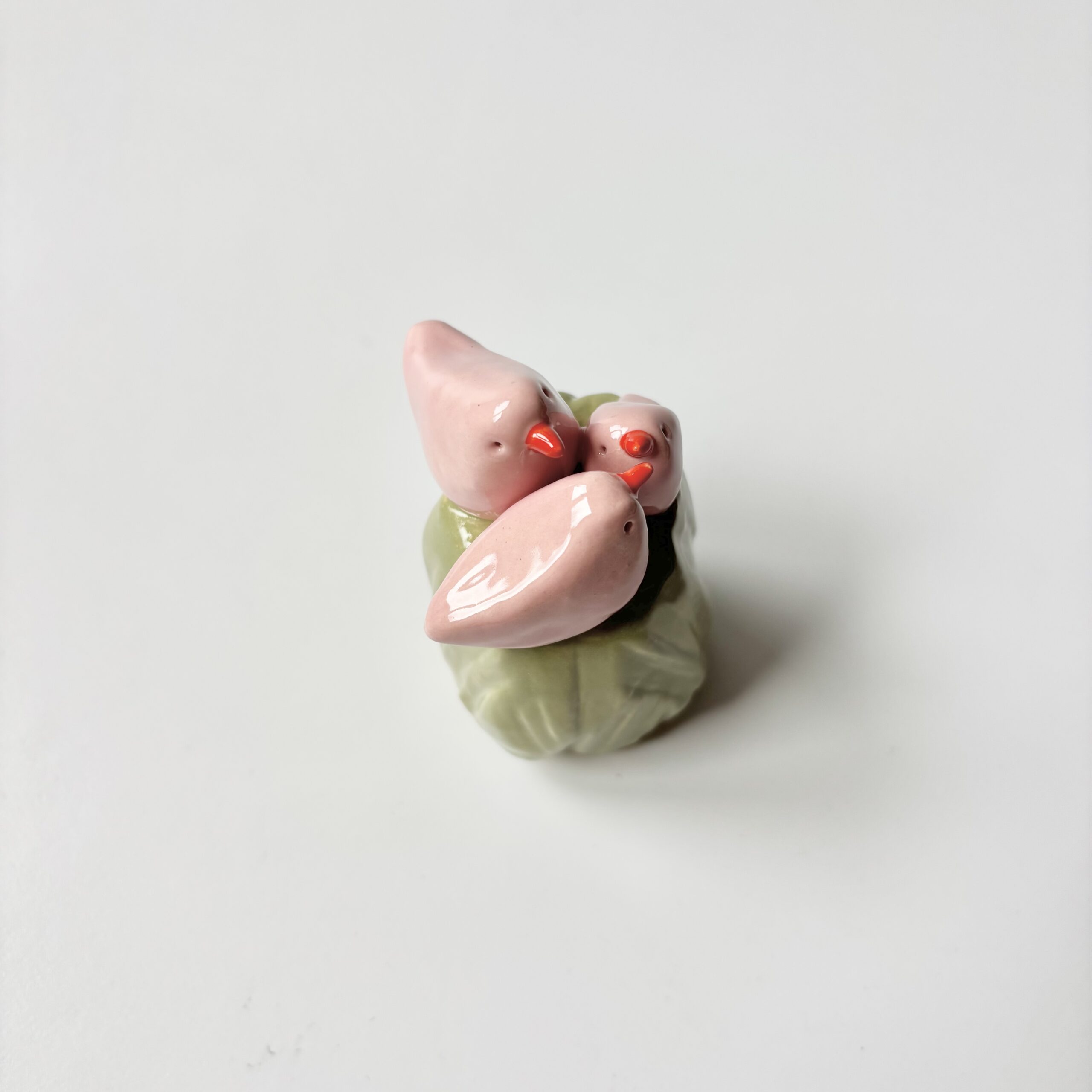 Vogels roze op groen stammetje van keramiek. Ik heb deze 3 vogels met de hand gevormd en ook het stammetje heb ik handgevormd. Daarna heb ik ze geglazuurd met een witte glazuur en het stammetje heb ik een zacht groene kleur gegeven. Een uniek cadeau voor jezelf of iemand anders, die lieverd die wat extra aandacht verdient, die vogelverzamelaar of voor jezelf. Er is maar één uniek exemplaar.